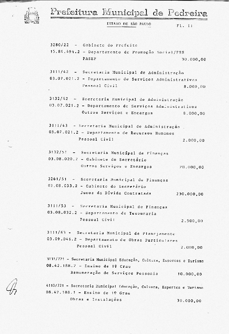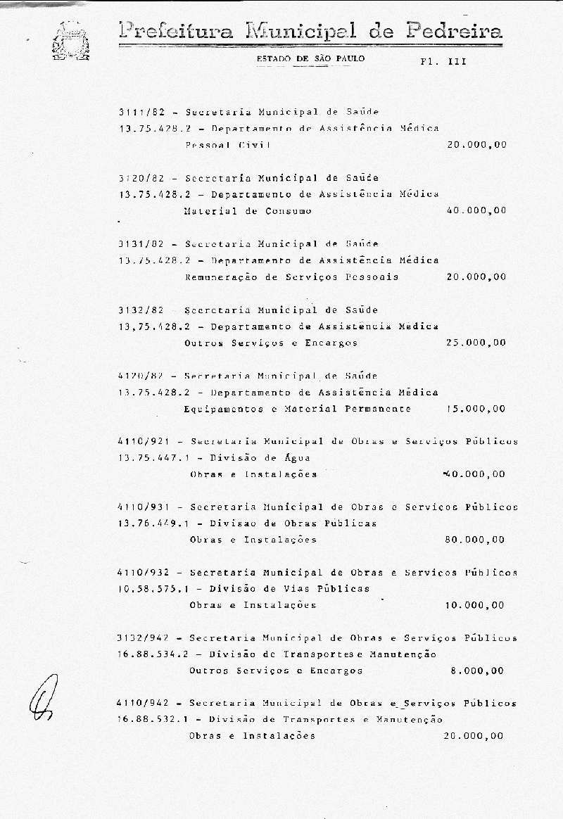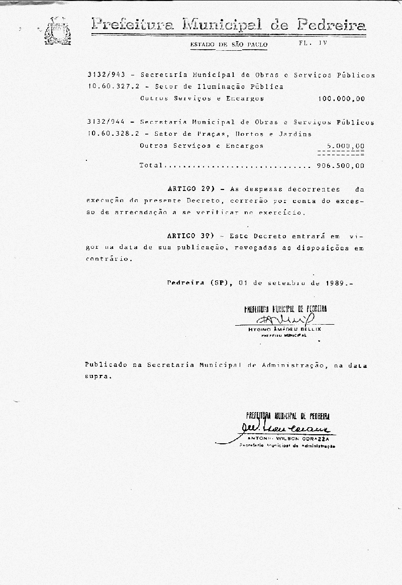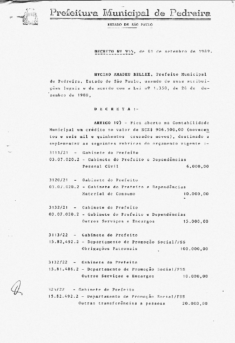 Ementa: Artigo 1° - Fica aberto na Contabilidade Municipal um crédito no valor de NCr$ 906.500,00 (novecentos e seis mil e quinhentos mil cruzados novos), destinados a suplementar as seguinte rubricas vigentes