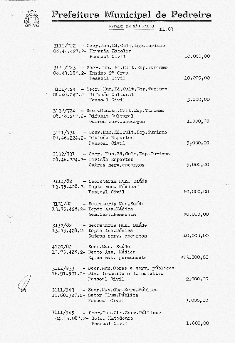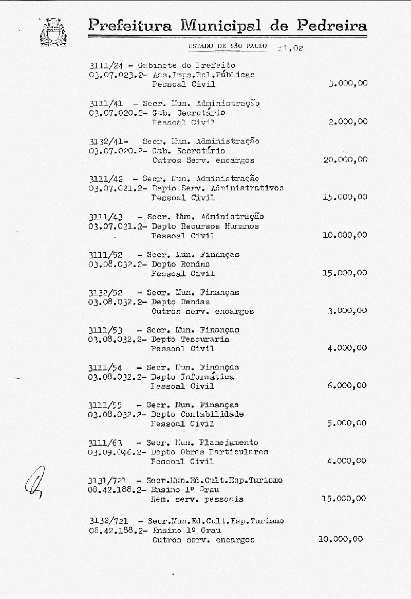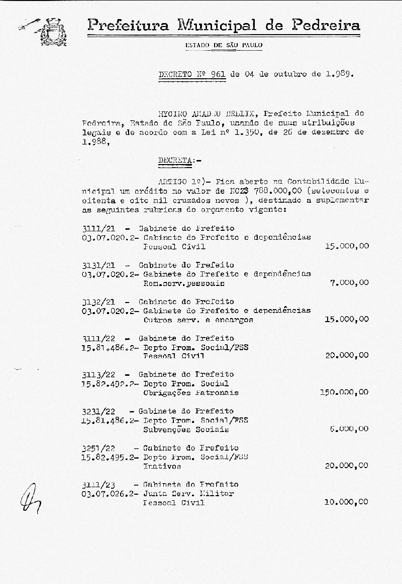 Ementa: Artigo 1° - Fica aberto na Contabilidade Municipal um crédito no valor de NCr$ 788.000,00 (setecentos e oitenta e oito mil cruzados novos), destinados a suplementar as seguinte rubricas vigentes