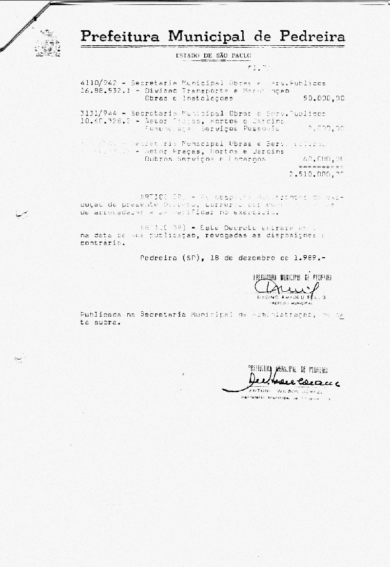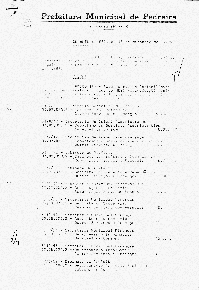 Ementa: Artigo 1° - Fica aberto na Contabilidade Municipal um crédito no valor de NCr$ 2.510.000,00 (dois milhões e quinhentos e dez mil cruzados novos), destinados a suplementar as seguinte rubricas vigentes