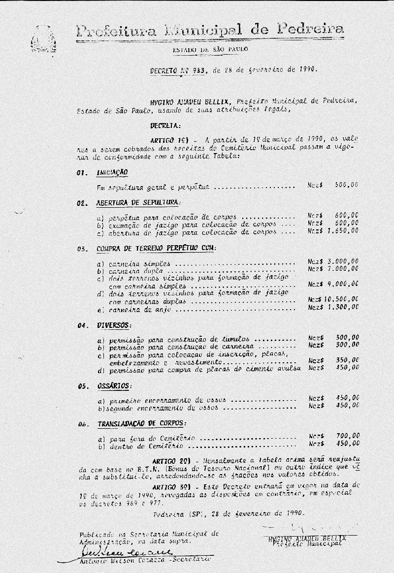 Ementa: Artigo 1° - A partir de 1° de março de 1990, os valores a serem cobrados das receitas do Cemitério Municipal passam a vigorar de conformidade coma seguinte tabela