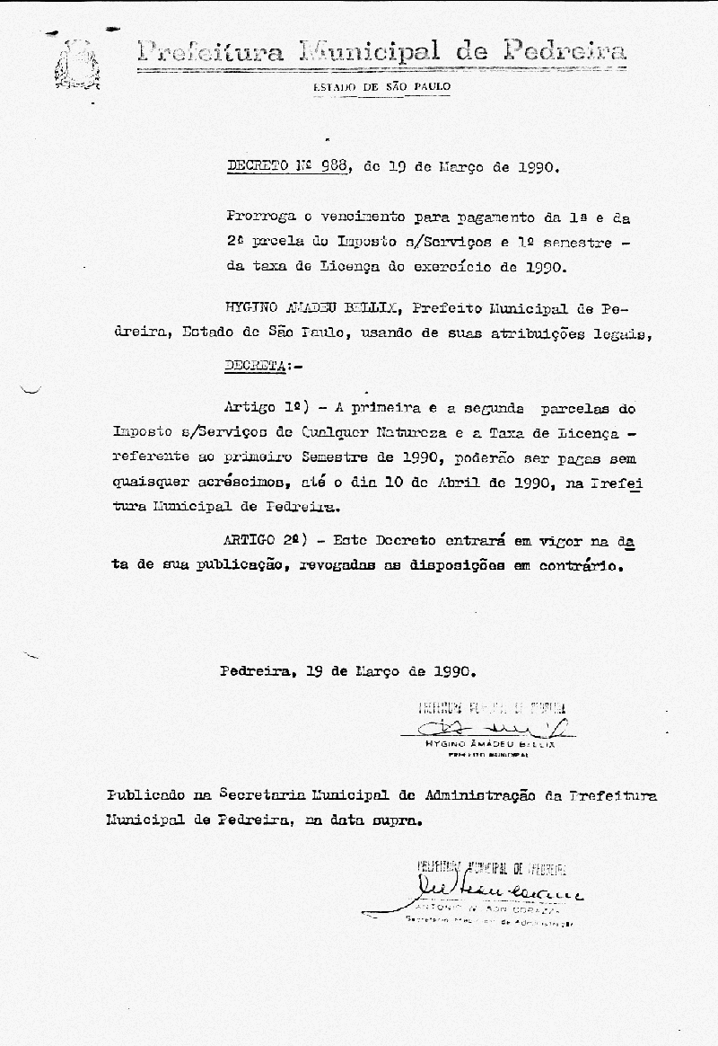 Ementa: Prorroga vencimento para pagamento da 1° e da 2° parcela do imposto a/serviços e 1° semestre da taxa de licença do exercício de 1990