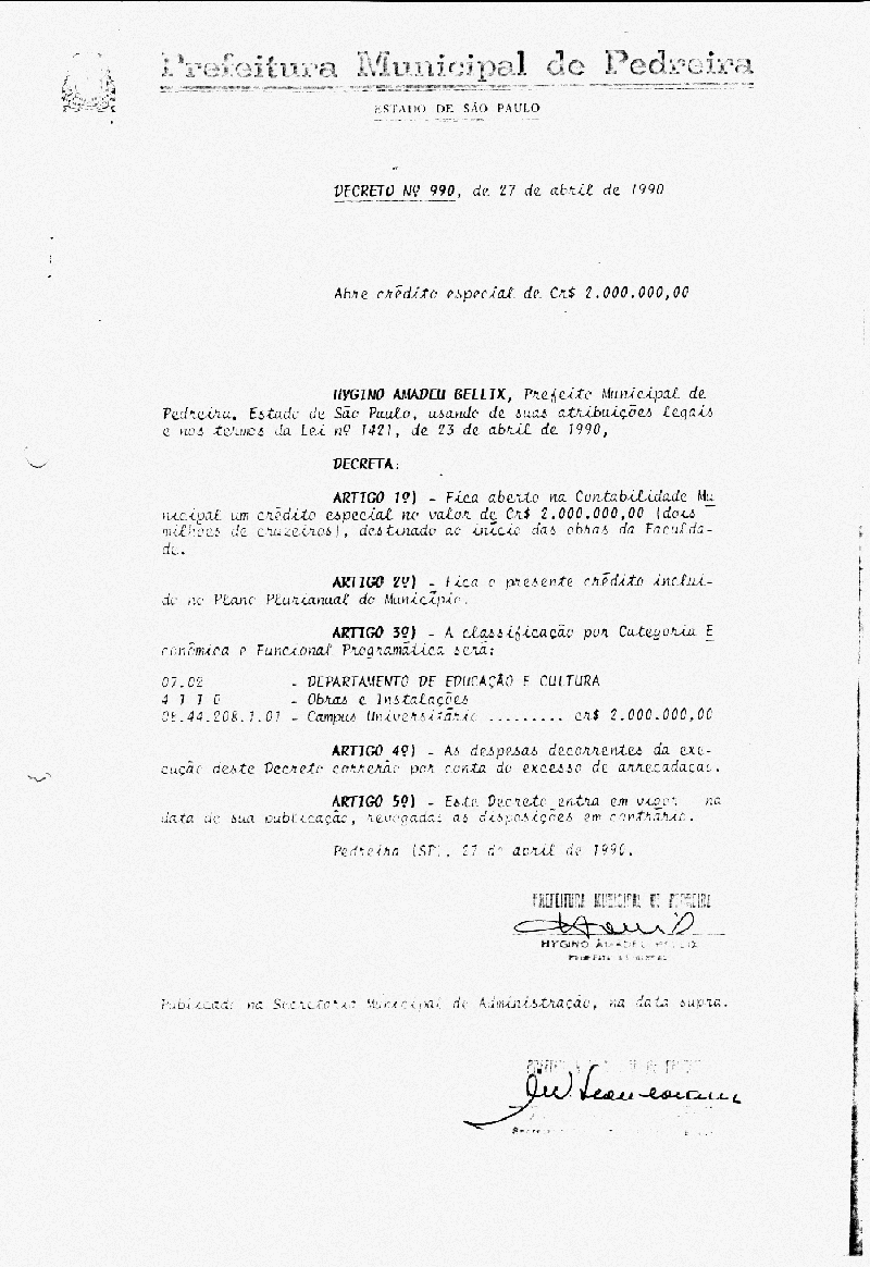 Ementa: Abre crédito especial de Cr$ 2.000.000,00