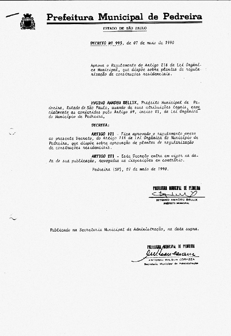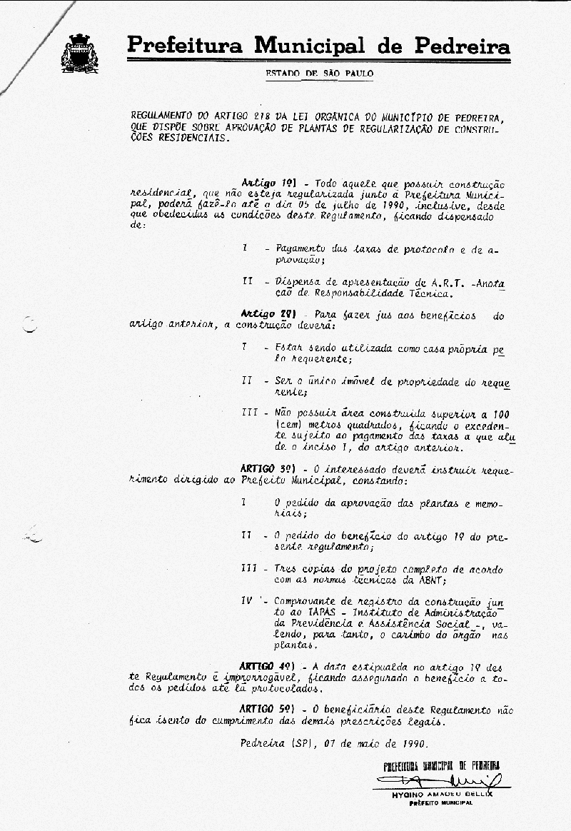 Ementa: Aprova o regulamento do Artigo 218 da Lei Orgânica Municipal, que dispõe sobre plantas de regularização de construções residenciais