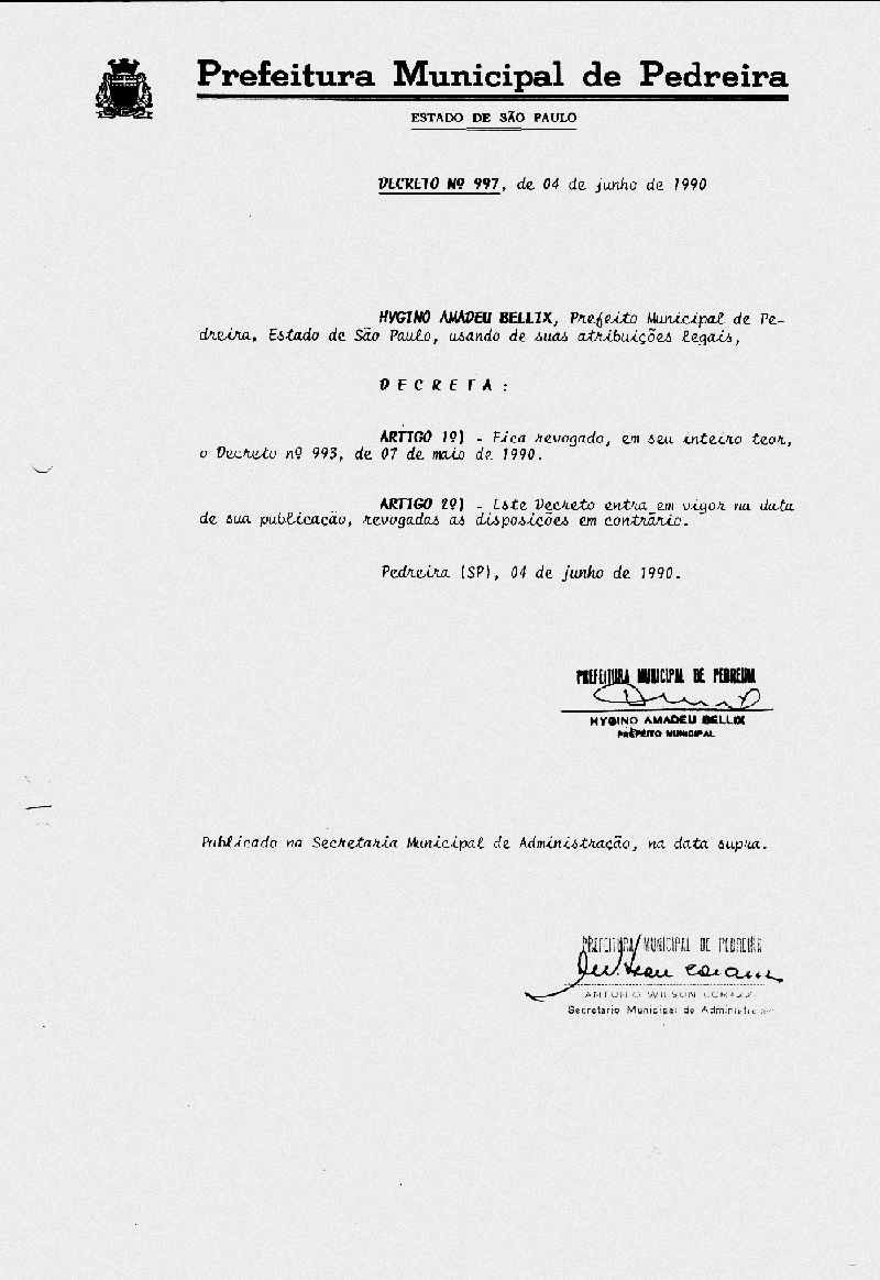 Ementa: Artigo 1° - Fica revogado, em seu inteiro teor, o Decreto n° 993, de 07 de maio de 1990