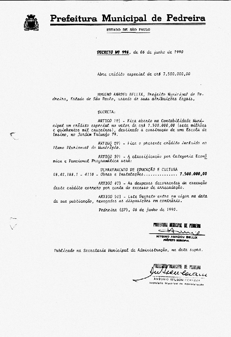 Ementa: Abre crédito especial de Cr$ 7.500.000,00