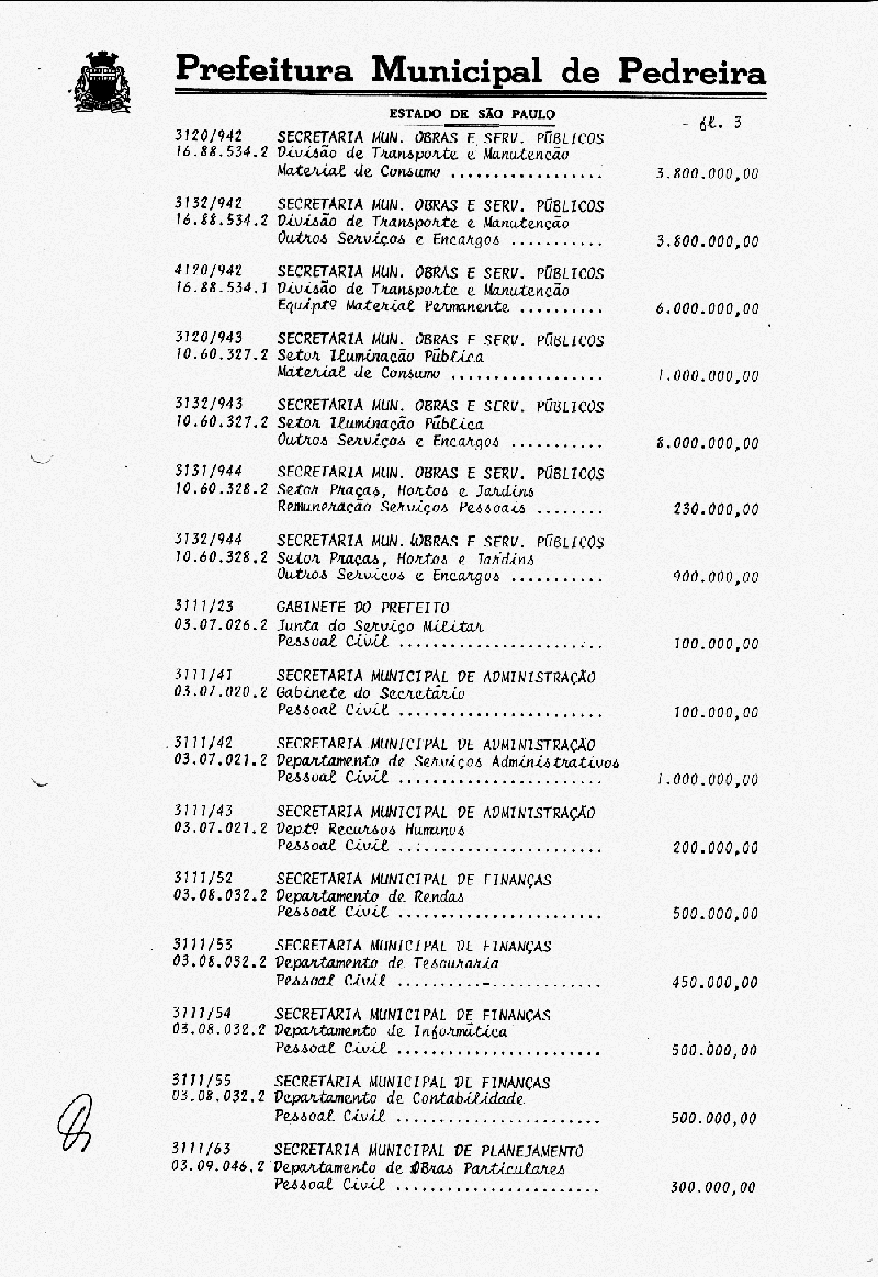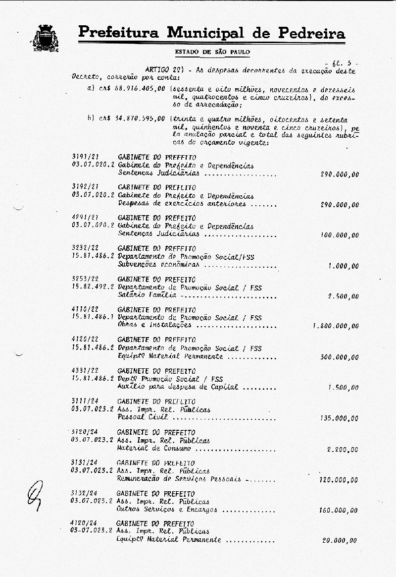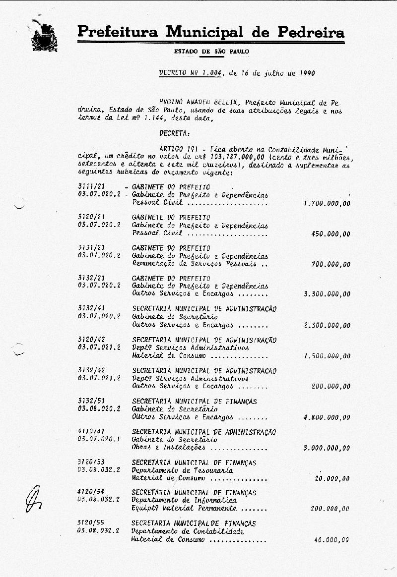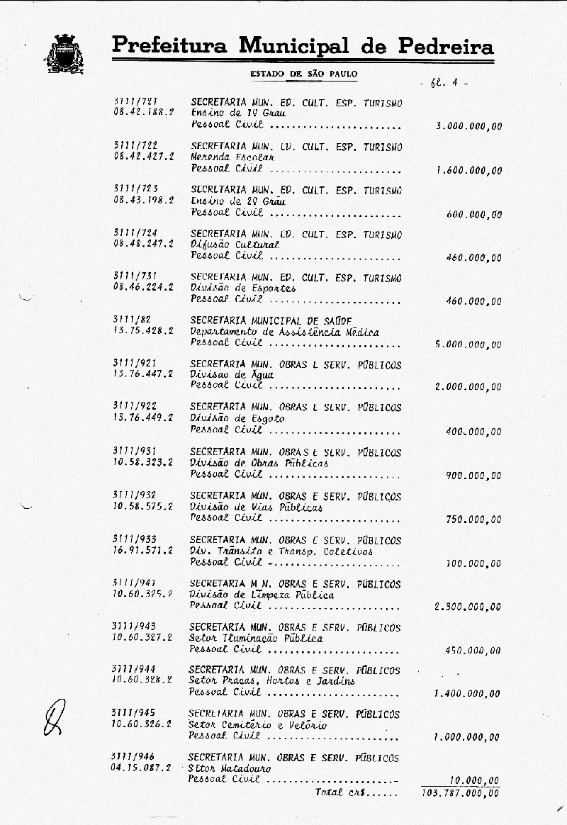 Ementa: Artigo 1° - Fica aberto na Contabilidade Municipal um crédito no valor de NCr$ 103.787.000,00 (cento e três milhões e setecentos e oitenta e sete mil cruzeiros), destinados a suplementar as seguintes rubricas vigentes