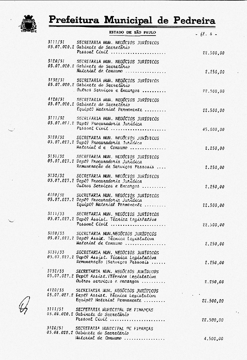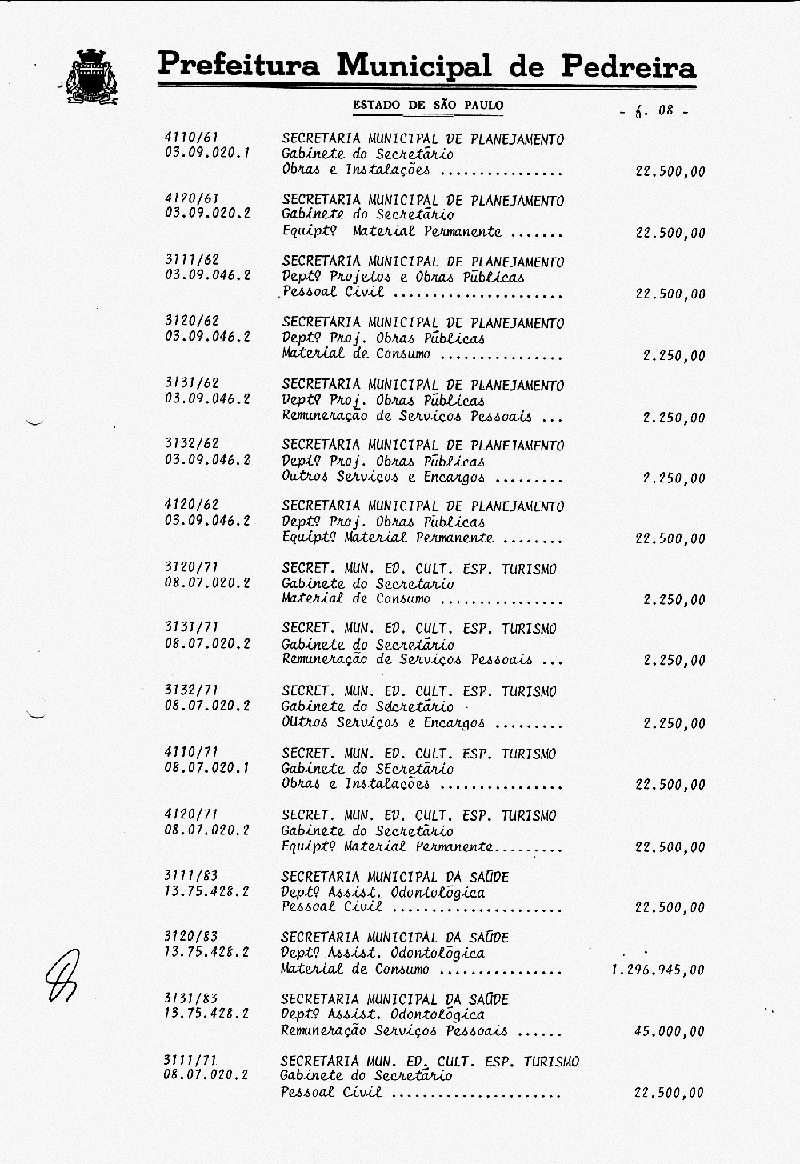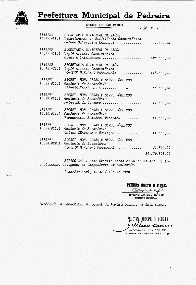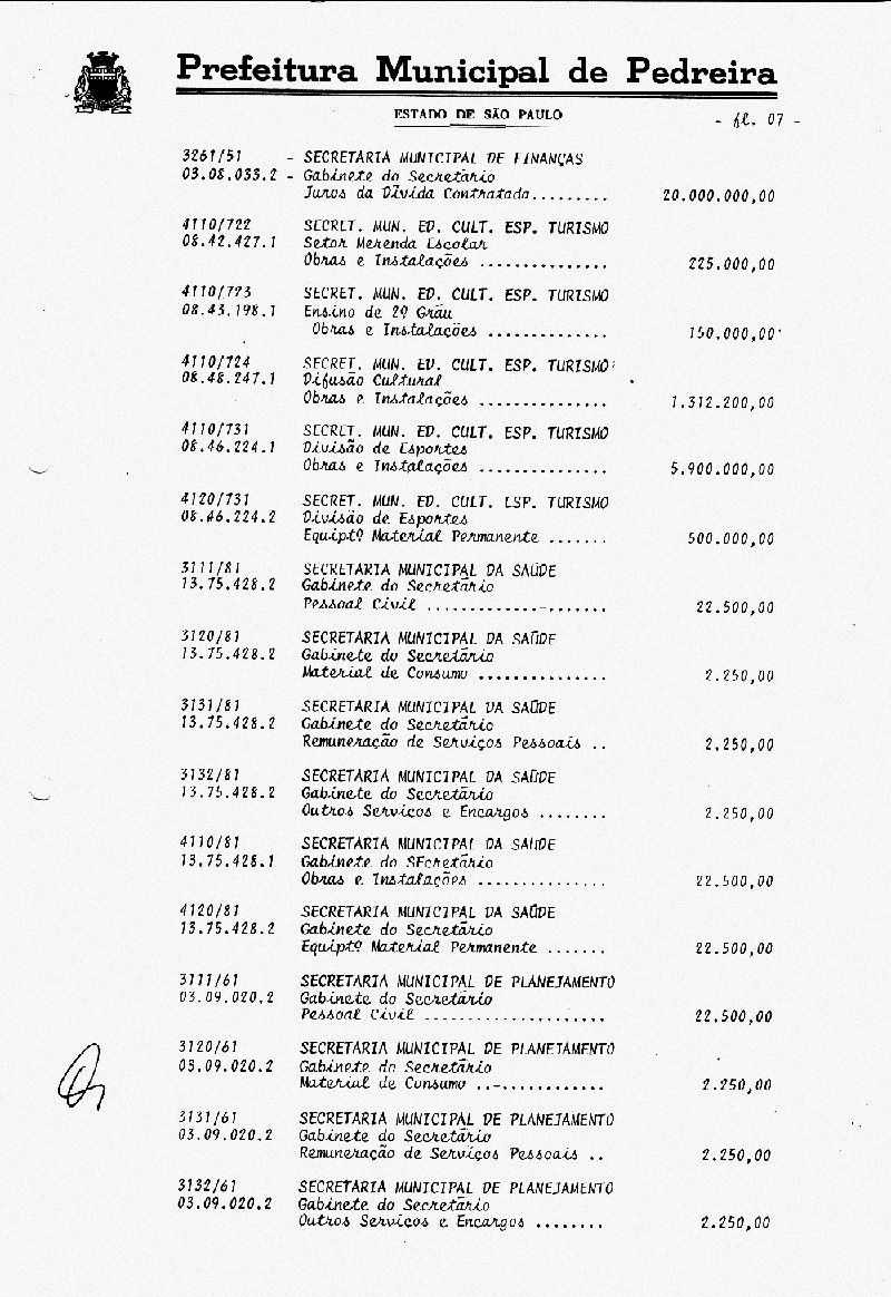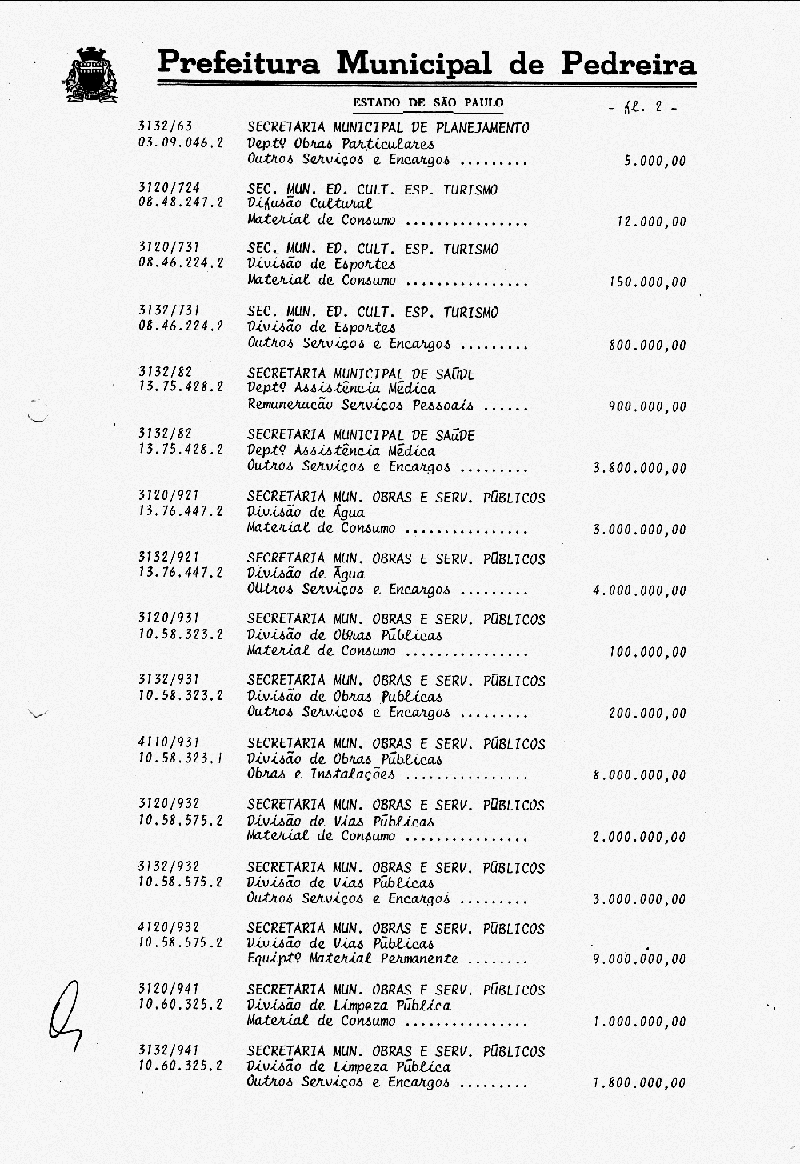 Ementa: Artigo 1° - Fica aberto na Contabilidade Municipal um crédito no valor de NCr$ 103.787.000,00 (cento e três milhões e setecentos e oitenta e sete mil cruzeiros), destinados a suplementar as seguintes rubricas vigentes