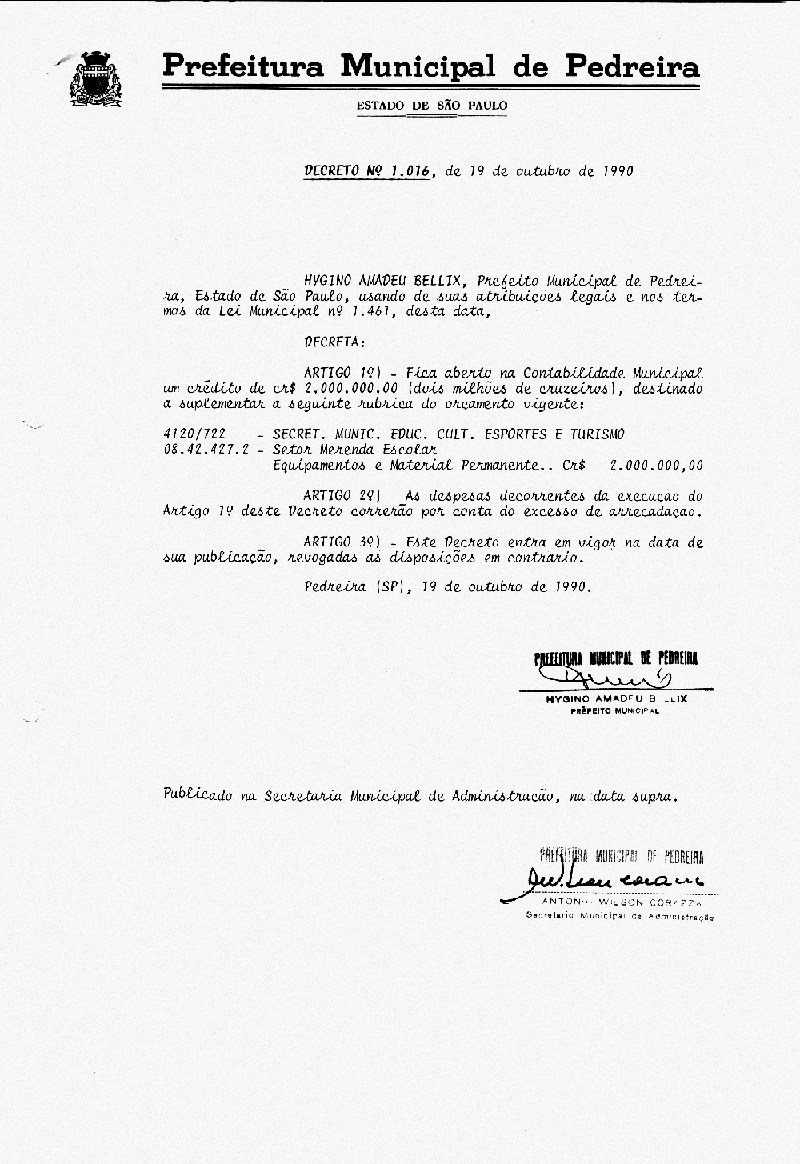 Ementa: Artigo 1° - Fica aberto na Contabilidade Municipal um crédito no valor de Cr$ 2.000.000,00(dois milhões e mil cruzeiros), destinados a suplementar as seguintes rubricas vigentes