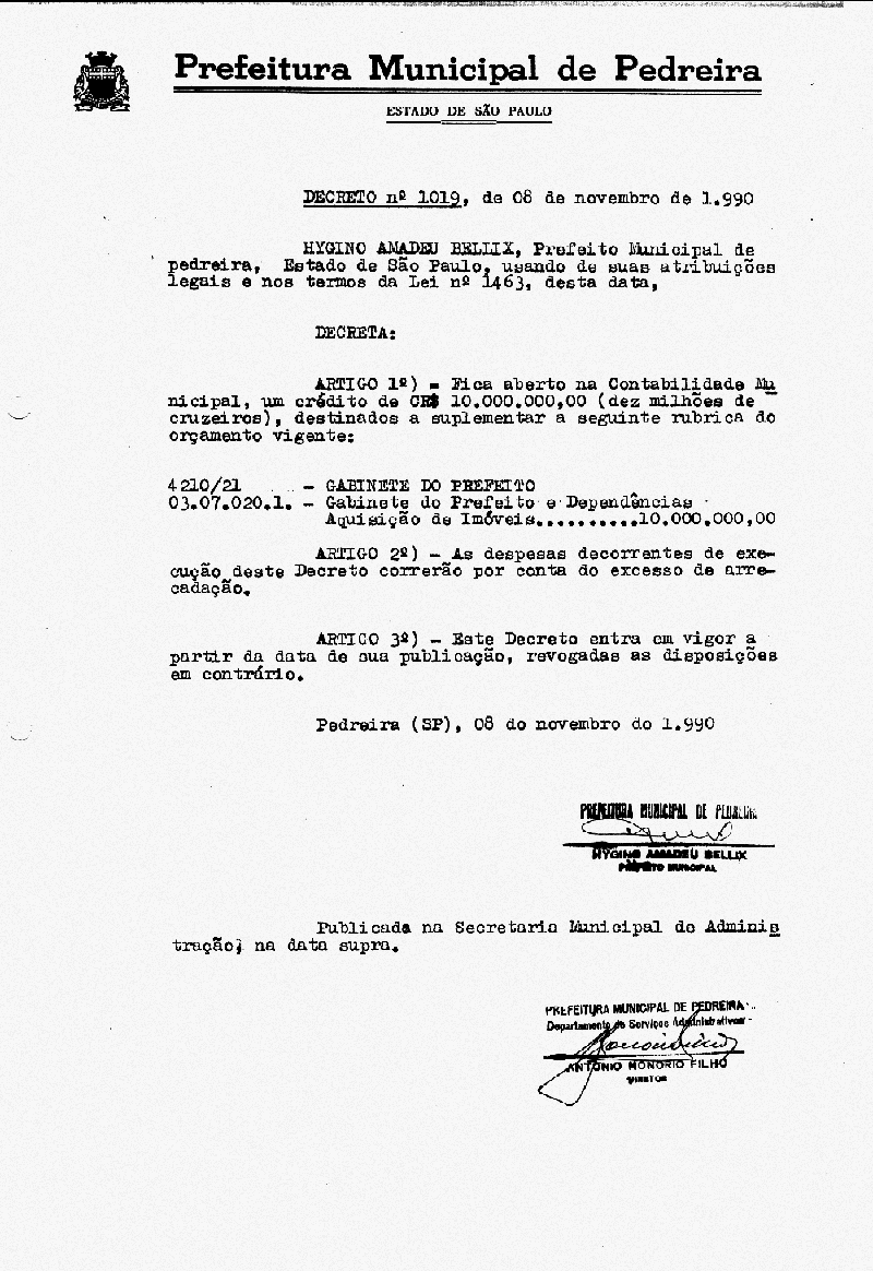 Ementa: Artigo 1° - Fica aberto na Contabilidade Municipal um crédito no valor de Cr$ 10.000.000,00 (dez milhões de cruzeiros), destinados a suplementar as seguintes rubricas vigentes