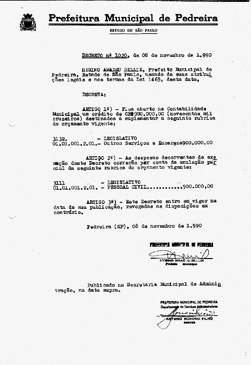 Ementa: Artigo 1° - Fica aberto na Contabilidade Municipal um crédito de Cr$ 900.000,00 (novecentos mil cruzeiros), destinados a suplementar a seguinte rubrica do orçamento vigente