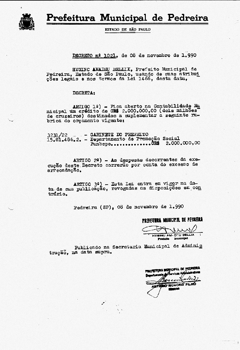 Ementa: Artigo 1° - Fica aberto na Contabilidade Municipal um crédito de Cr$ 2.000.000,00 (dois milhões de cruzeiros), destinados a suplementar a seguinte rubrica do orçamento vigente