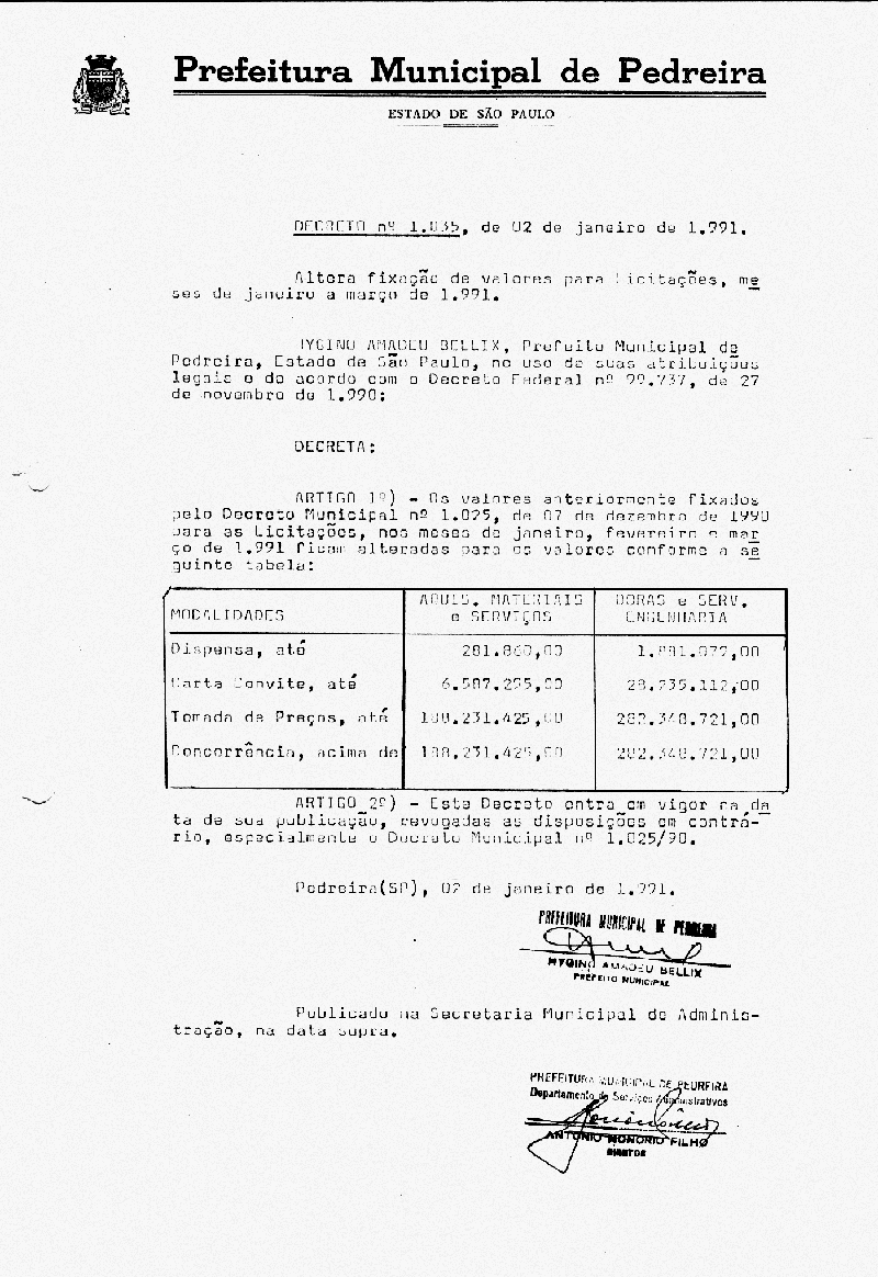 Ementa: Altera fixação de valores para licitação, meses de janeiro a março de 1991