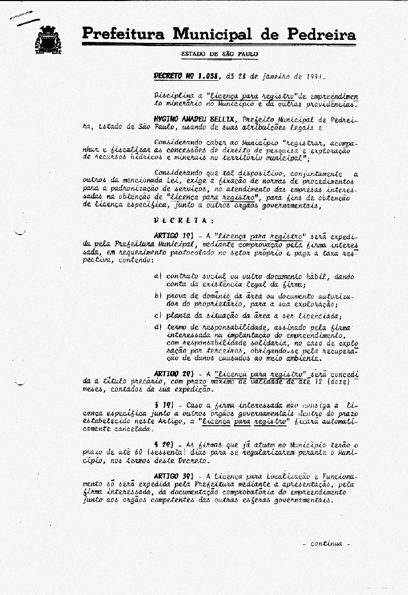 Ementa: Disciplina a "licença para registro" de empreendimento minerário no Município e da outras providências