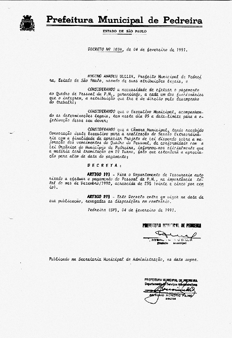 Ementa: Considerando a necessidade de efetuar o pagamento ao quadro de pessoal da P.M., garantindo, a cada um dos funcionários que o integram, a retribuição que lhe é de direito pelo desempenho do trabalho