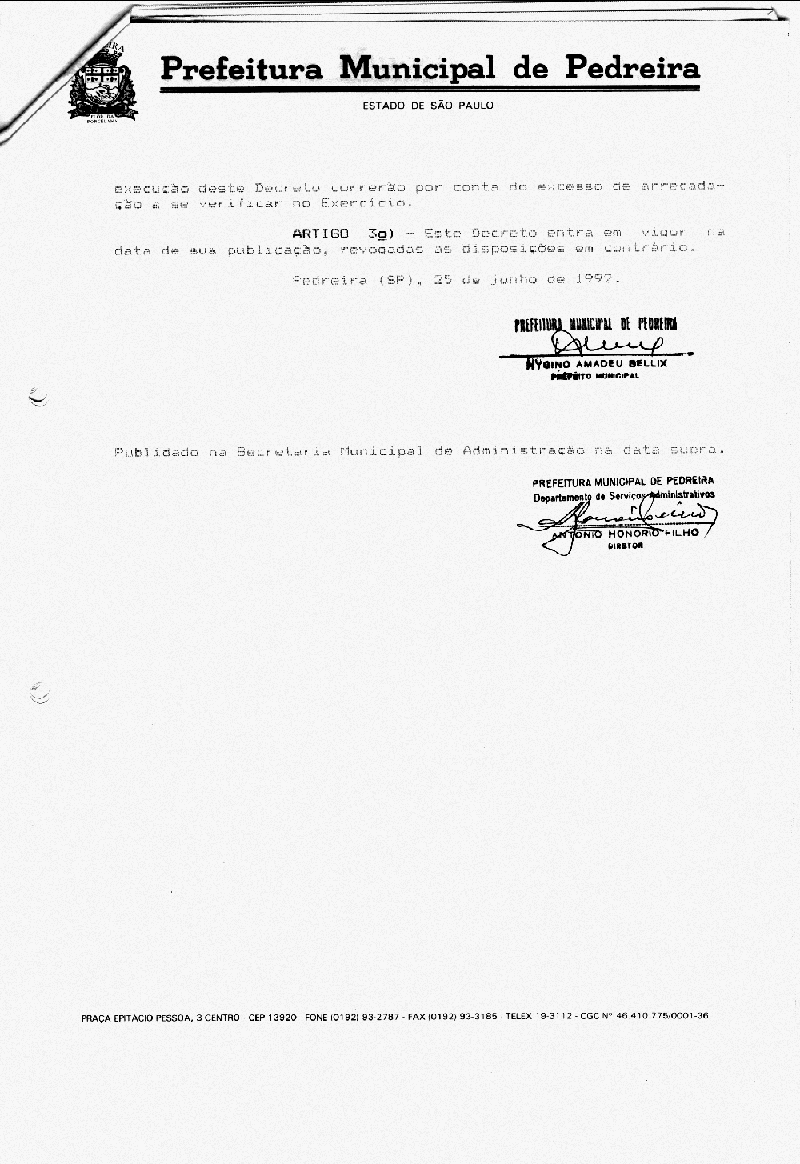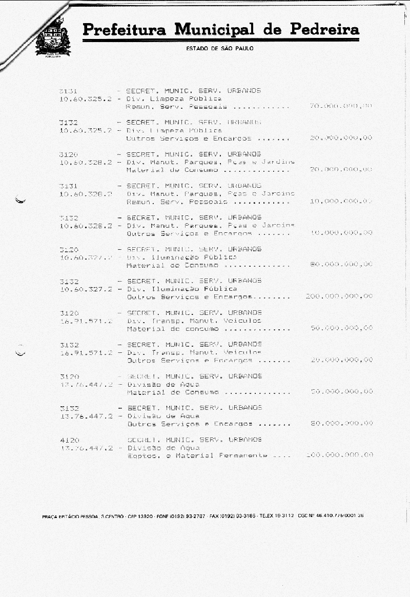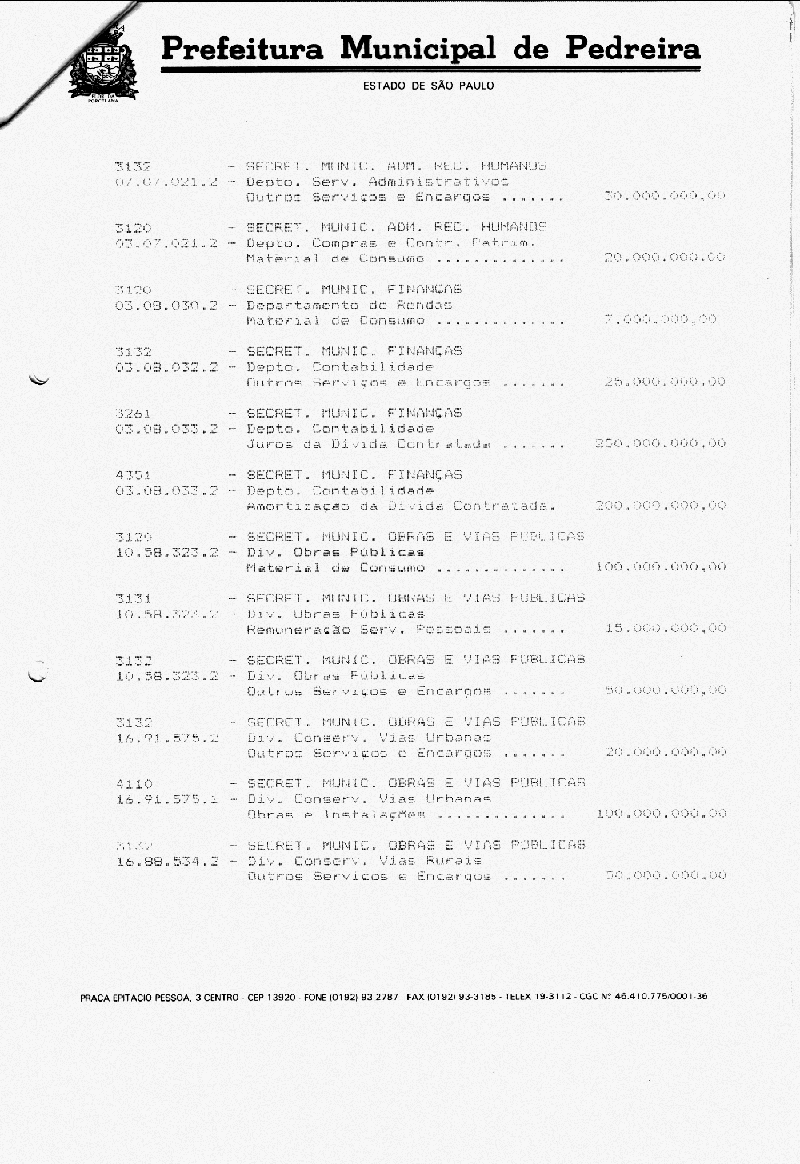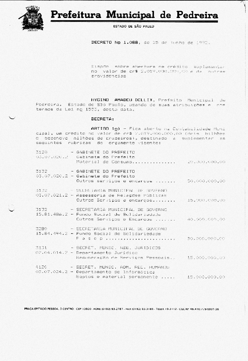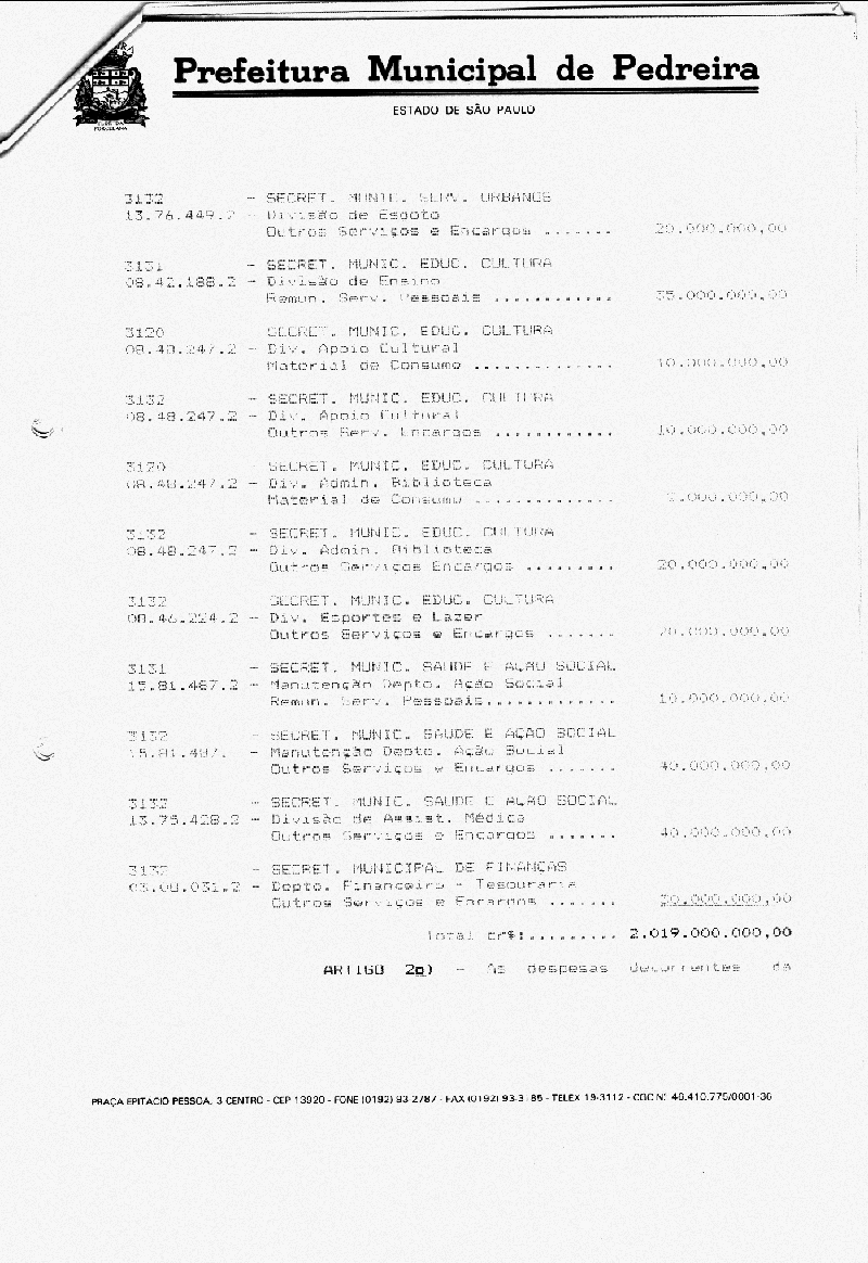 Ementa: Dispõe sobre abertura de crédito suplementar no valor de Cr$ 2.019.000,000,00 (dois bilhões e dezenove milhões de cruzeiros), destinados a suplementar as seguintes rubricas do orçamento vigente