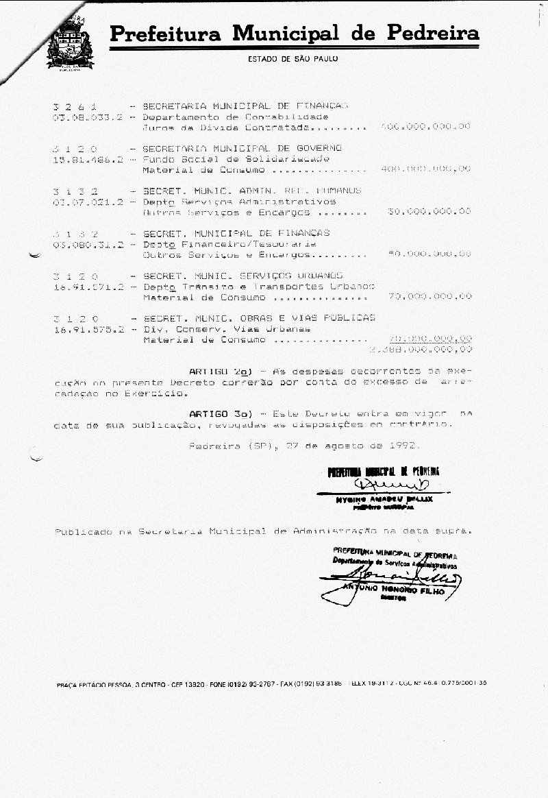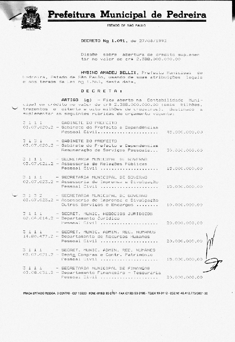 Ementa: Dispõe sobre abertura de crédito suplementar no valor de Cr$ 2.388.000.000,00