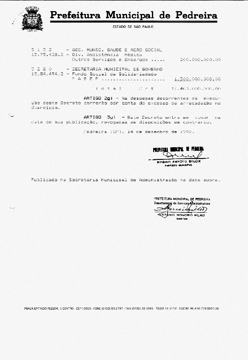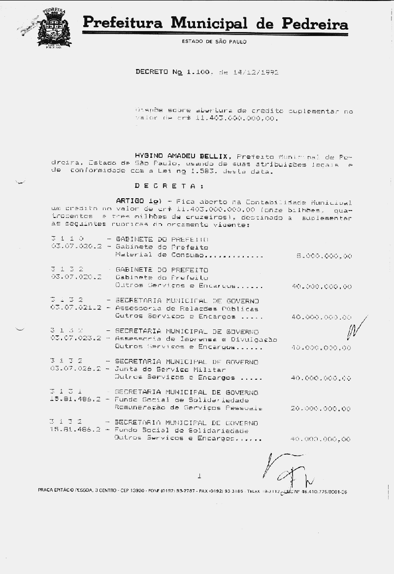 Ementa: Dispõe sobre abertura de crédito suplementar no valor de Cr$ 11.403.000.000,00