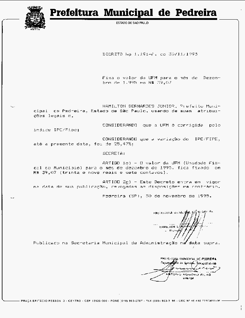 Ementa: Fixa valor da UFM para o mês de dezembro de 1995 em R$ 39,07