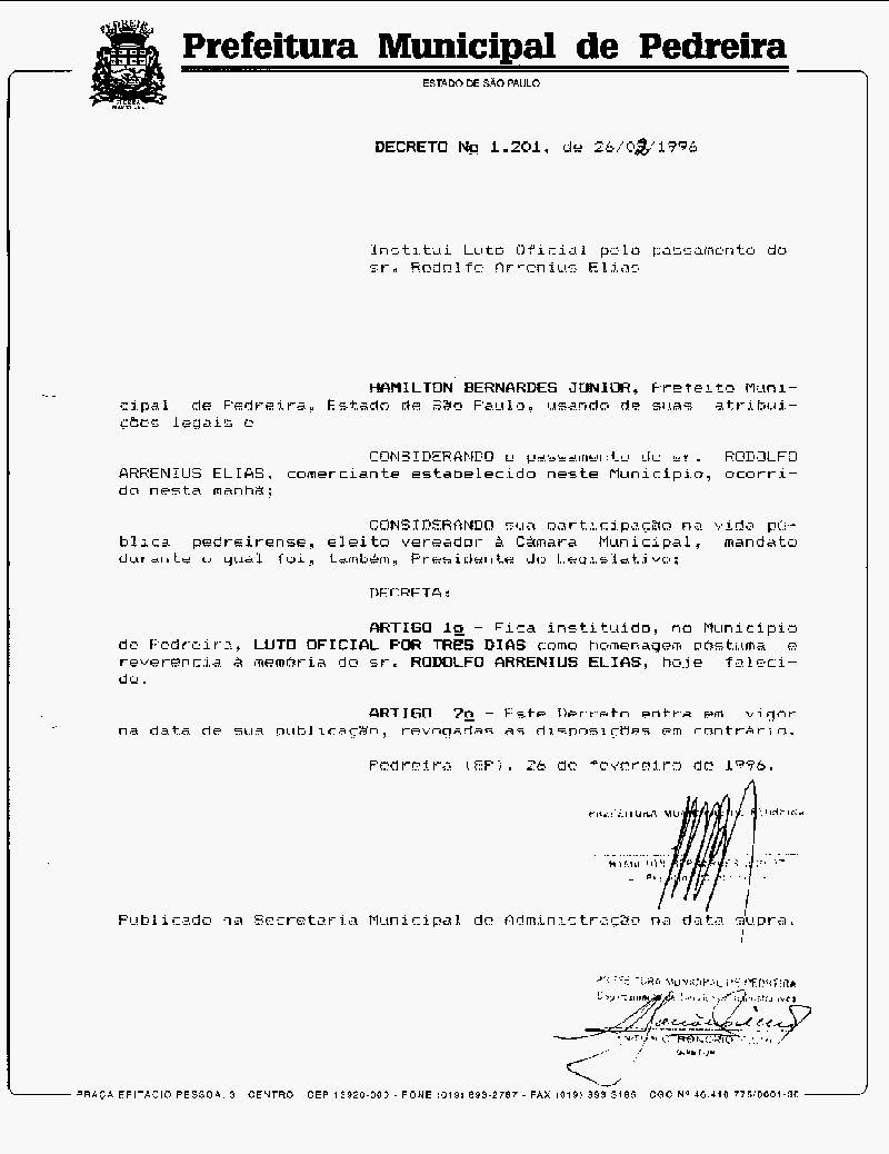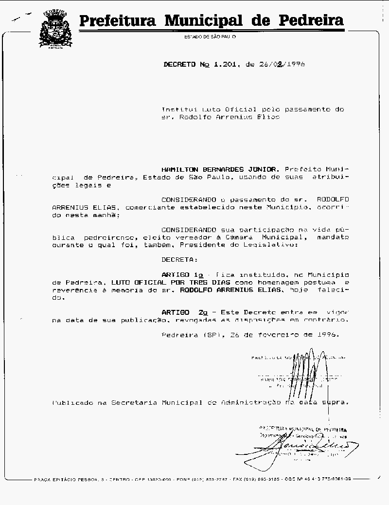 Ementa: Institui Luto Oficial pelo passamento do Sr. Rodolfo Arrenius Elias