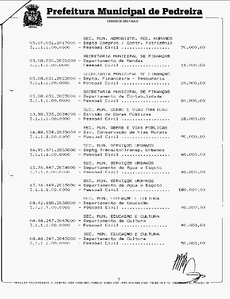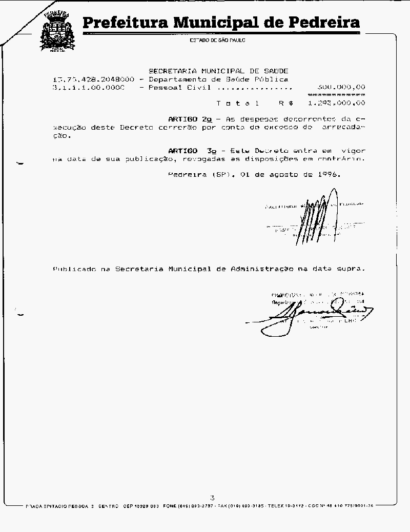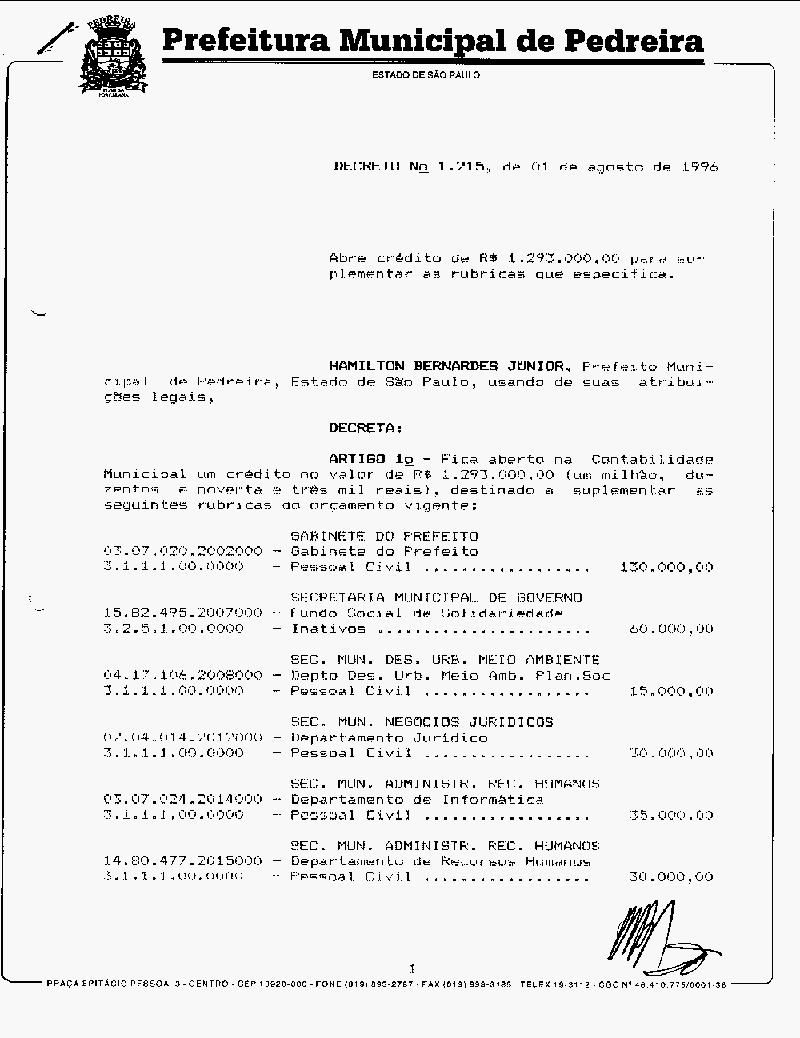 Ementa: Abre crédito de R$ 1.293.000,00 para suplementar as rubricas vigentes que especifica