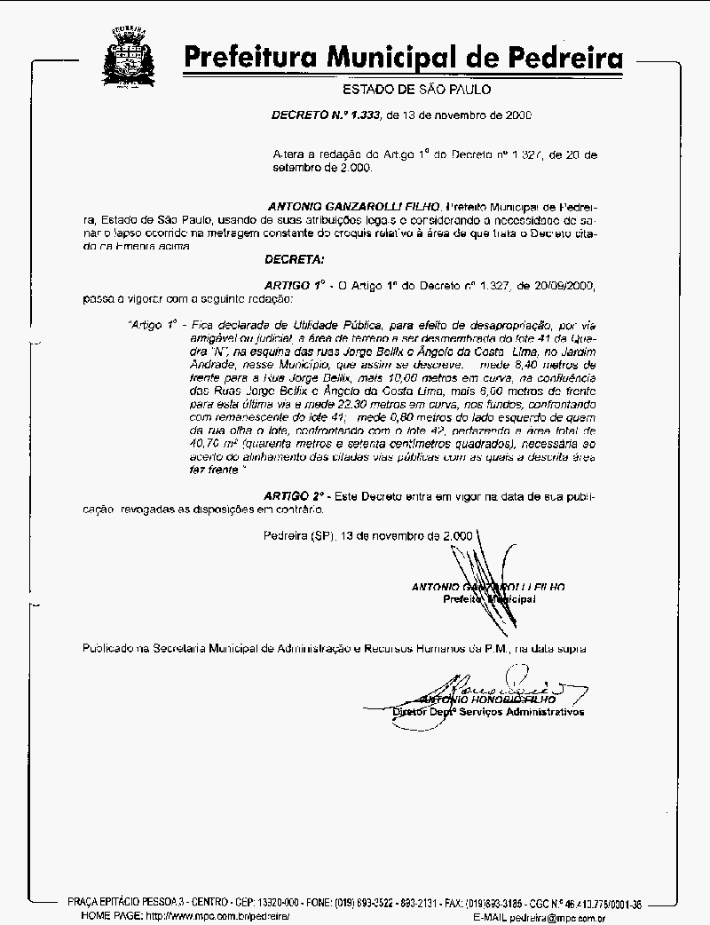 Ementa: Altera a redação do Artigo 1° do Decreto n° 1320, de 20 de setembro de 2000