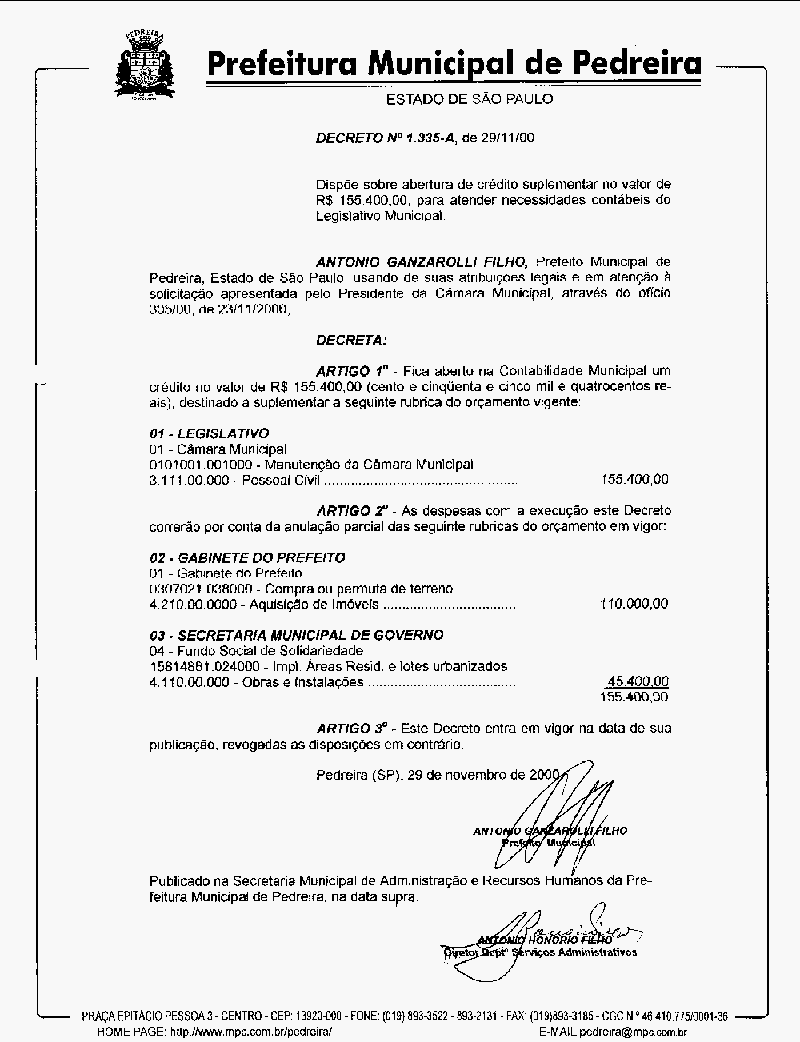 Ementa: Dispõe sobre abertura de crédito suplementar no valor de R$ 155.400,00, para atender necessidades contábeis do legislativo Municipal
