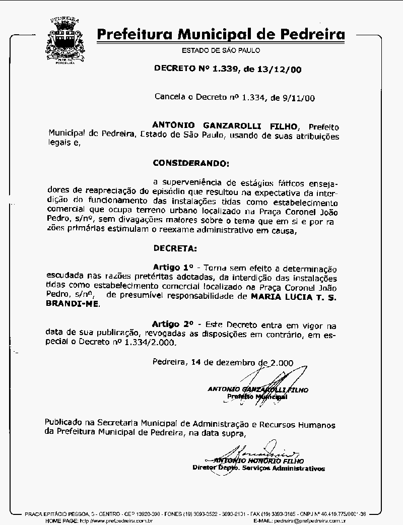 Ementa: Cancela o Decreto n° 1334, de 09/11/2000
