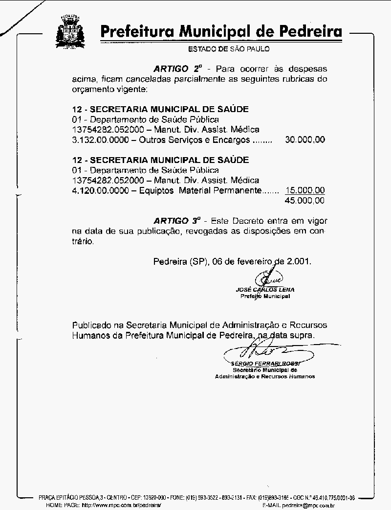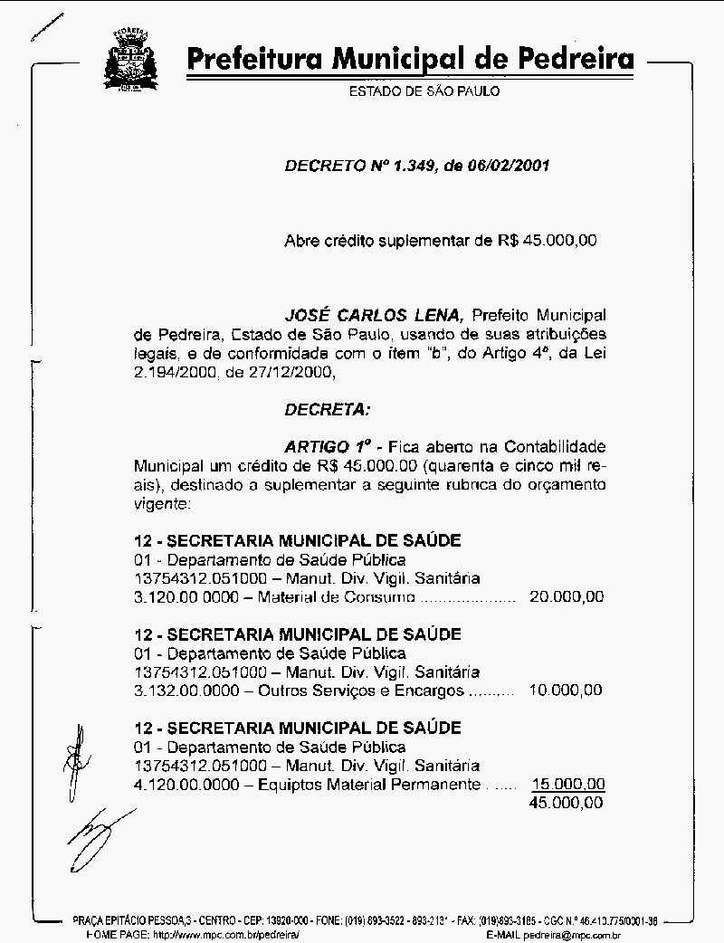 Ementa: Abre crédito suplementar de R$ 45.000,00