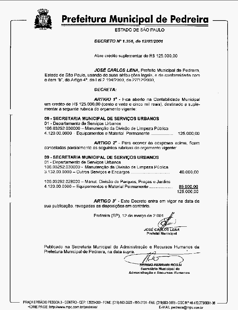 Ementa: Abre crédito suplementar de R$ 125.000,00