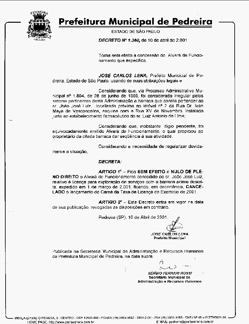 Ementa: Torna sem efeito a concessão do Alvará de Funcionamento que especifica