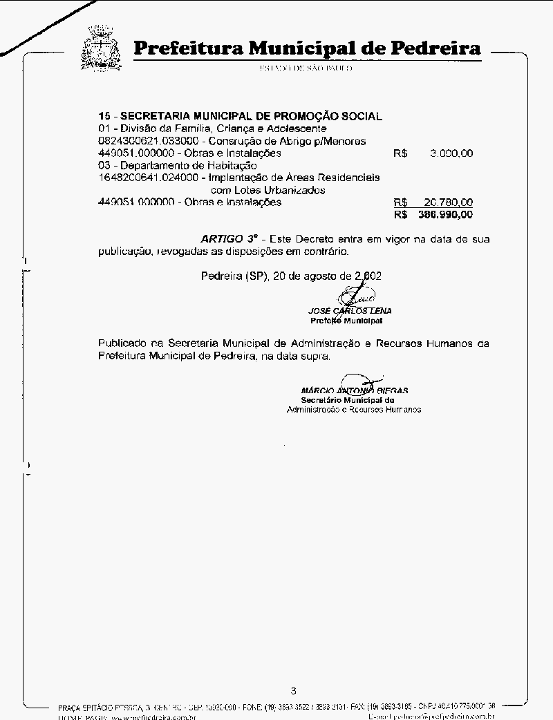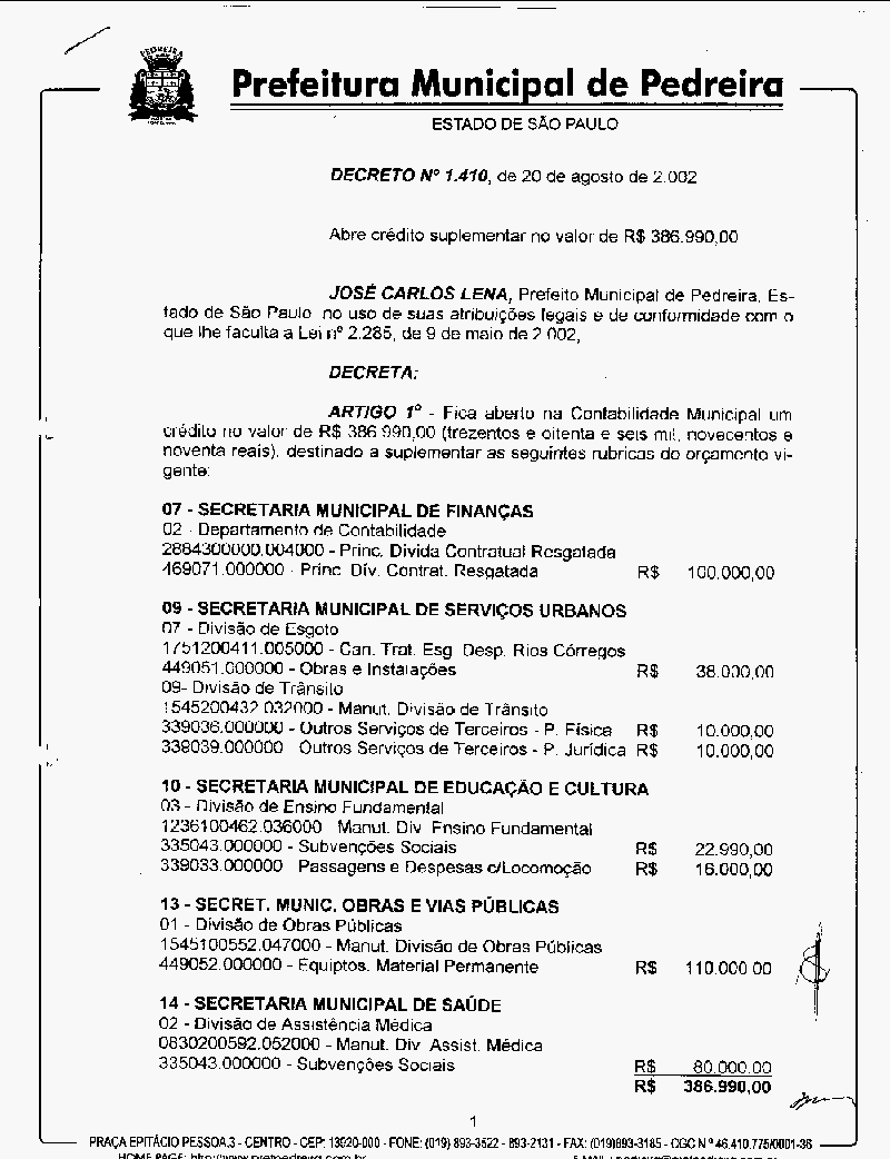 Ementa: Abre crédito suplementar no valor de R$ 386.990,00