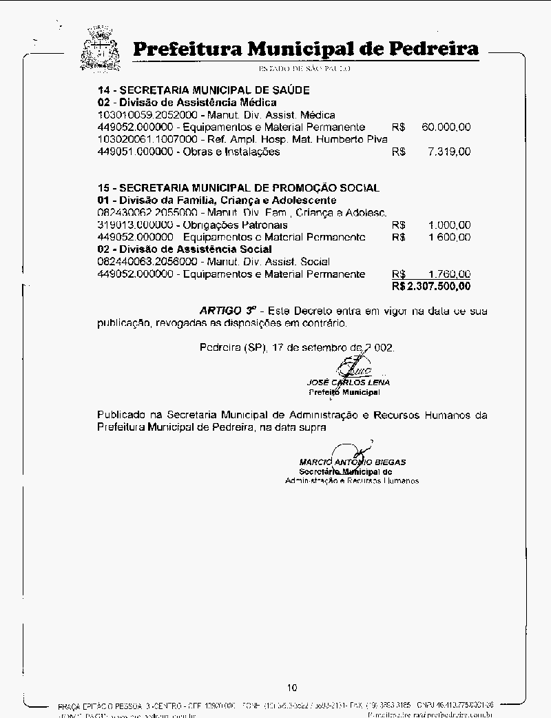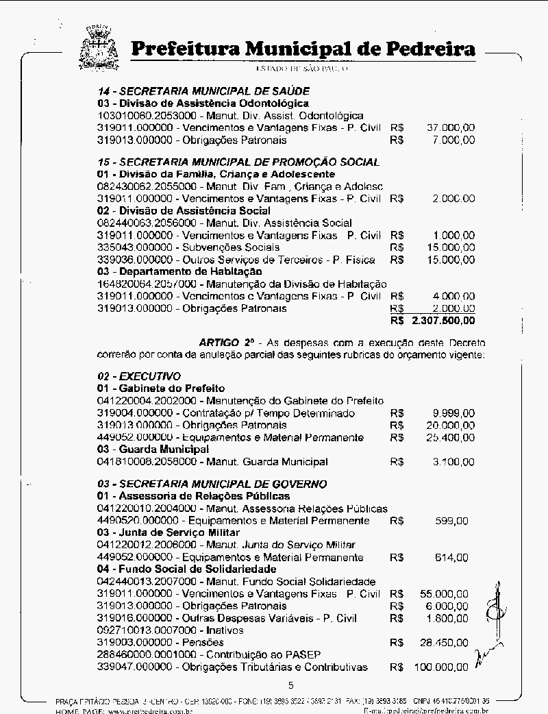Ementa: Abre crédito suplementar no valor de R$ 2.307.500,00