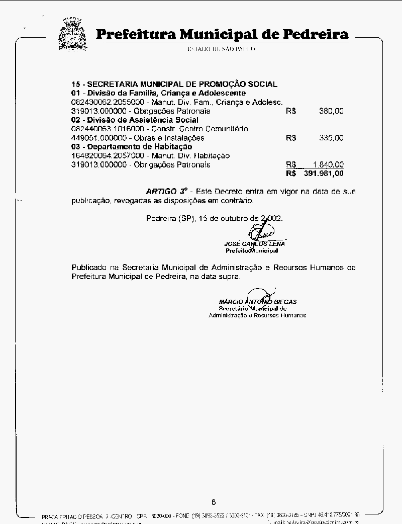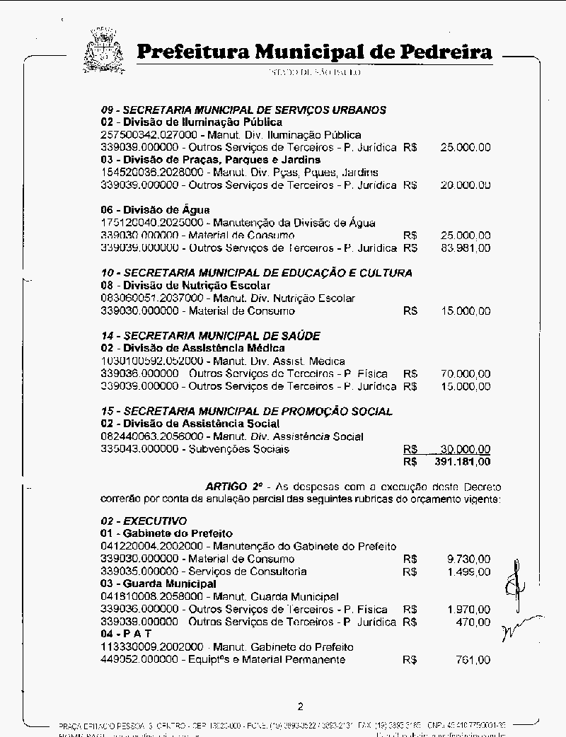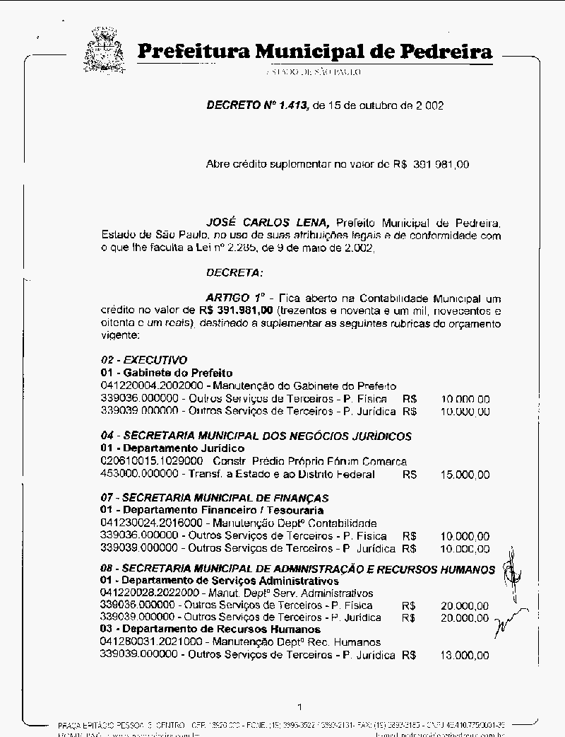 Ementa: Abre crédito suplementar no valor de R$ 391.981,00