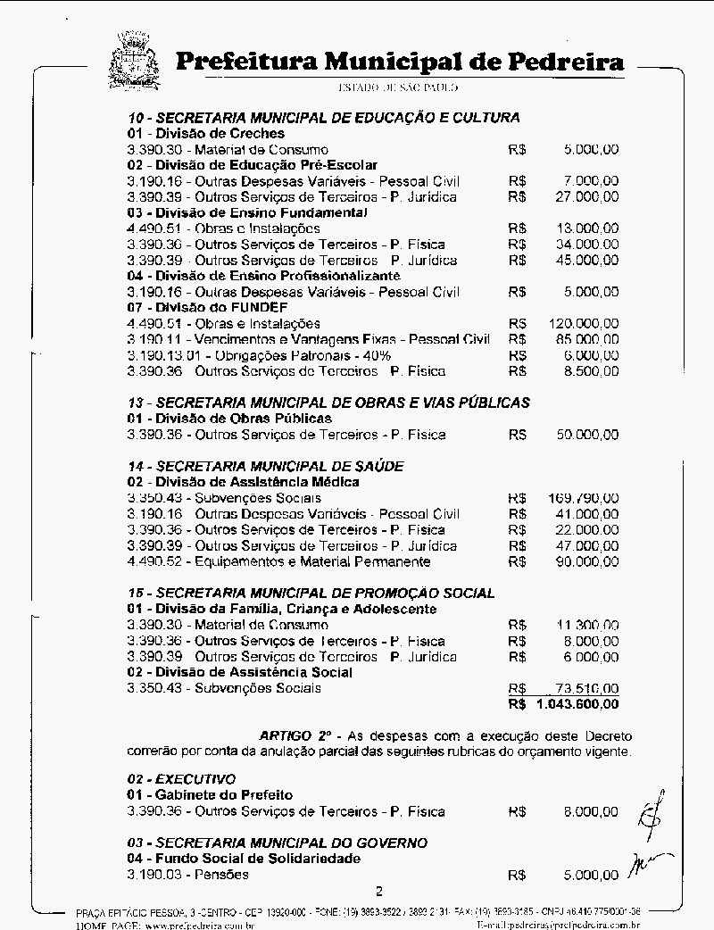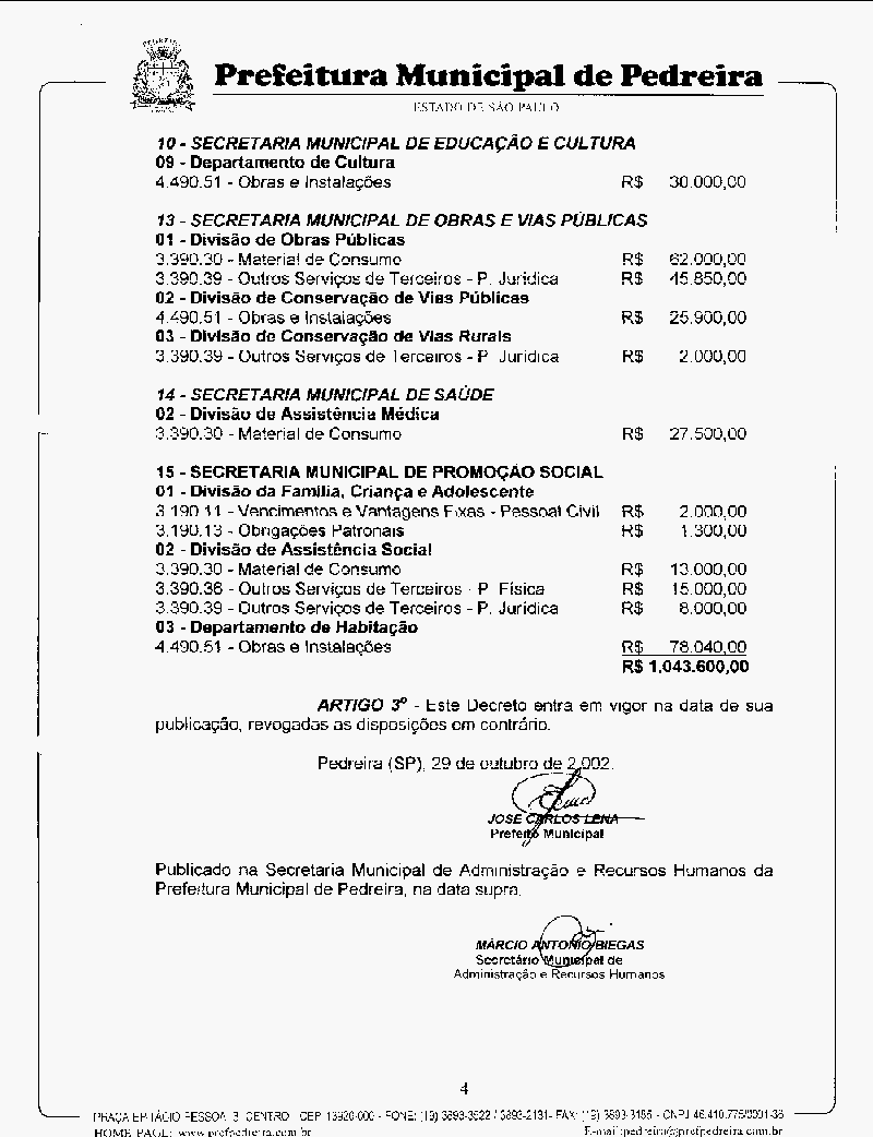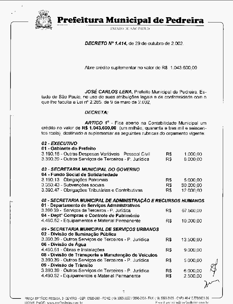 Ementa: Abre crédito suplementar no valor de R$ 1.043.600,00
