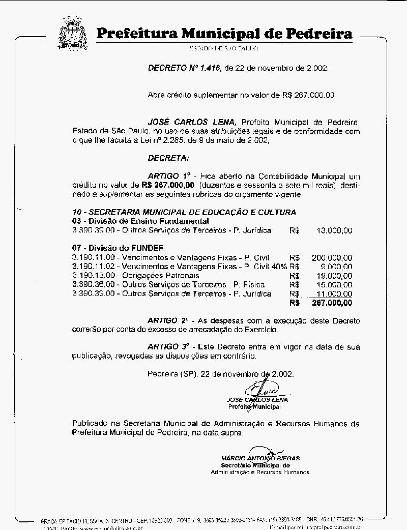 Ementa: Abre crédito suplementar no valor de R$ 267.000,00