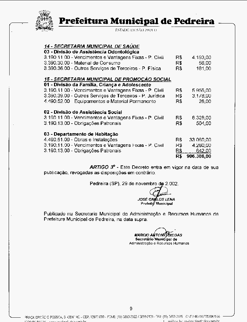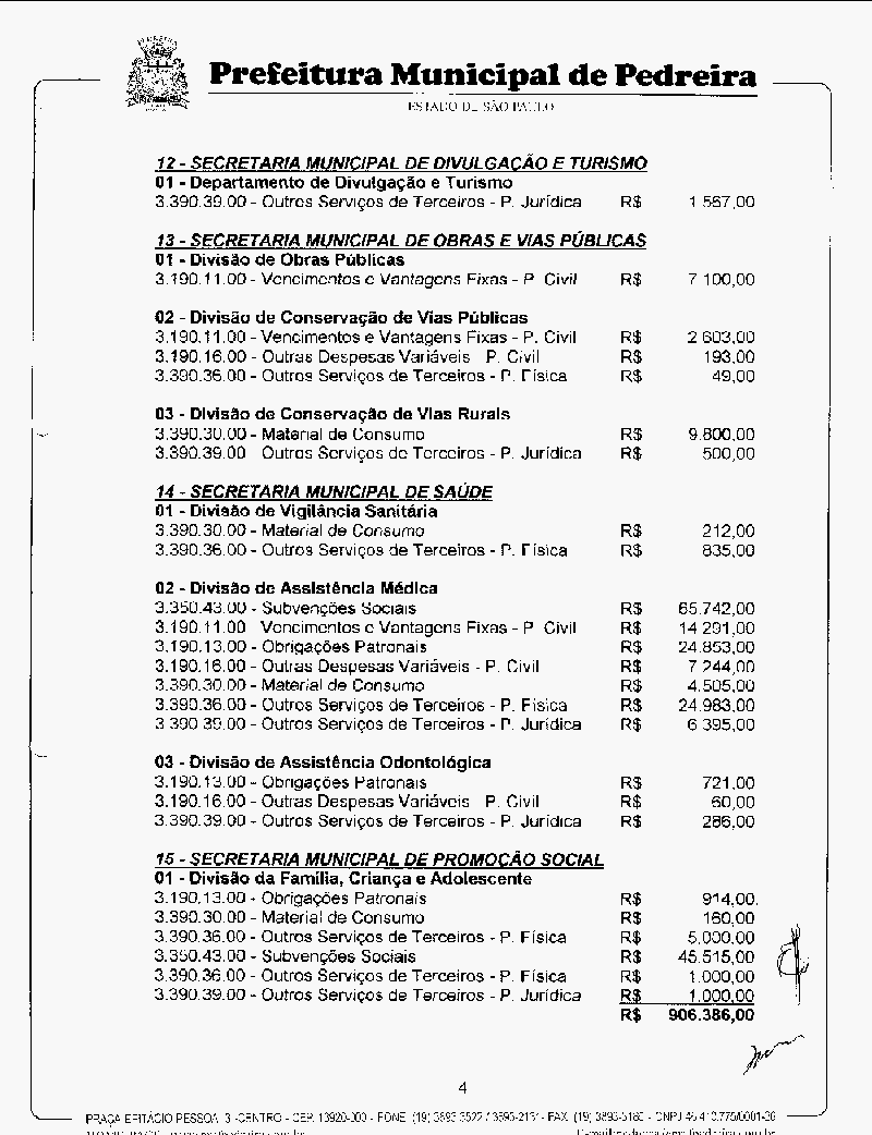 Ementa: Abre crédito suplementar no valor de R$ 906.386,00