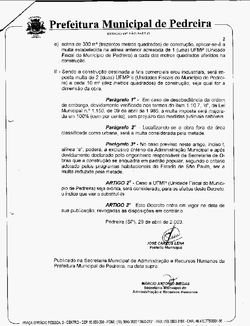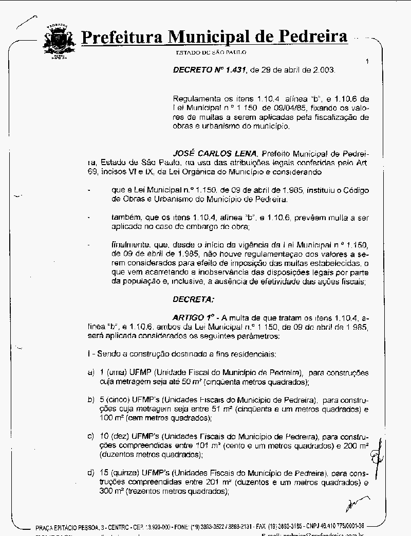 Ementa: Regulamenta os itens 1.104 alinea "b", e 1.106 da lei municipal n° 1.150 de 09/04/1985, fixando os valores de multas a serem aplicadas pela fiscalização de obras e urbanismo do município