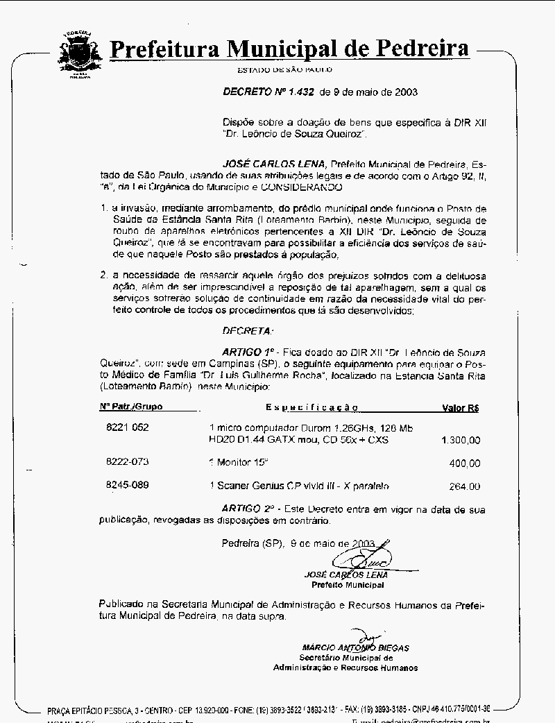Ementa: Dispõe sobre a doação de bens que especifica à DIR XII "Dr. Leôncio de Souza Queiroz"