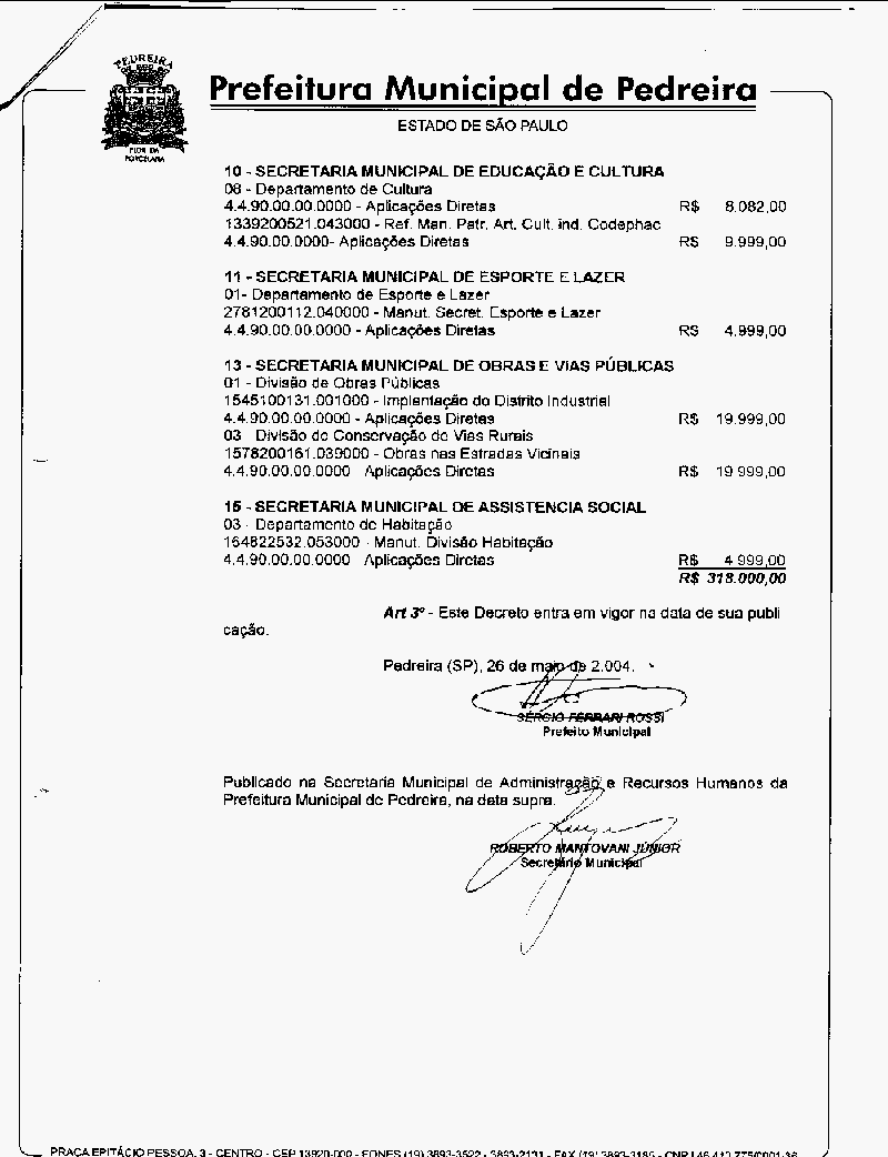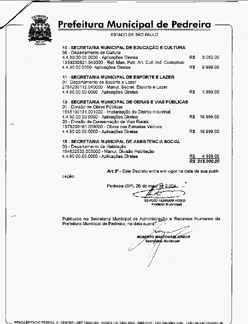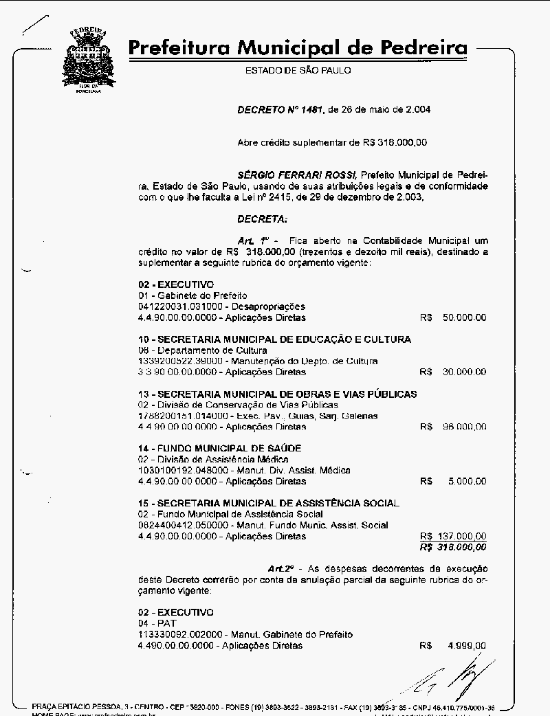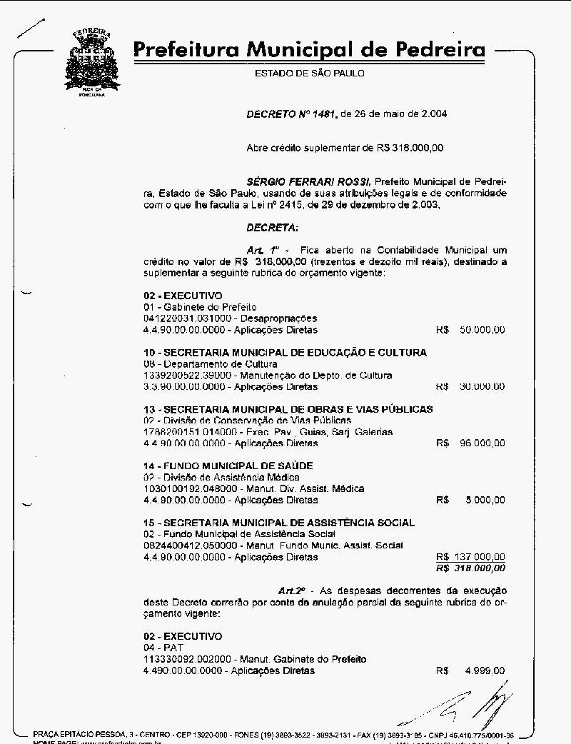 Ementa: Abre crédito suplementar no valor de R$ 318.000,00