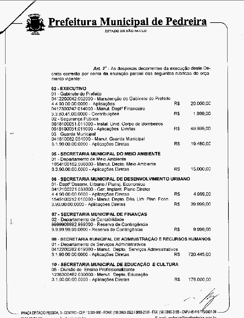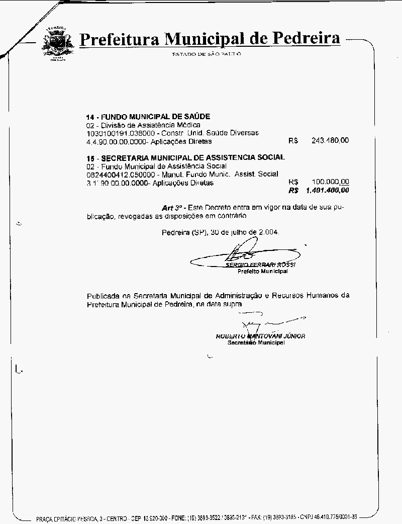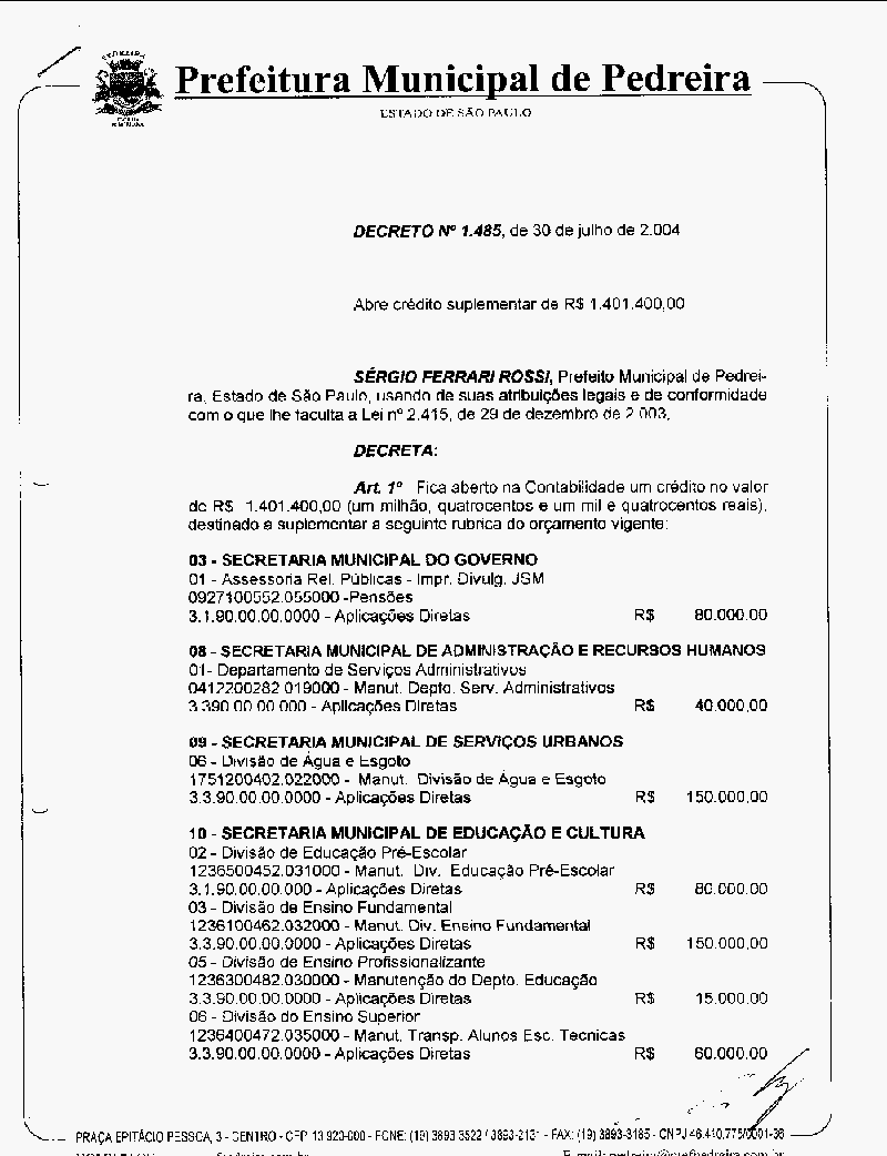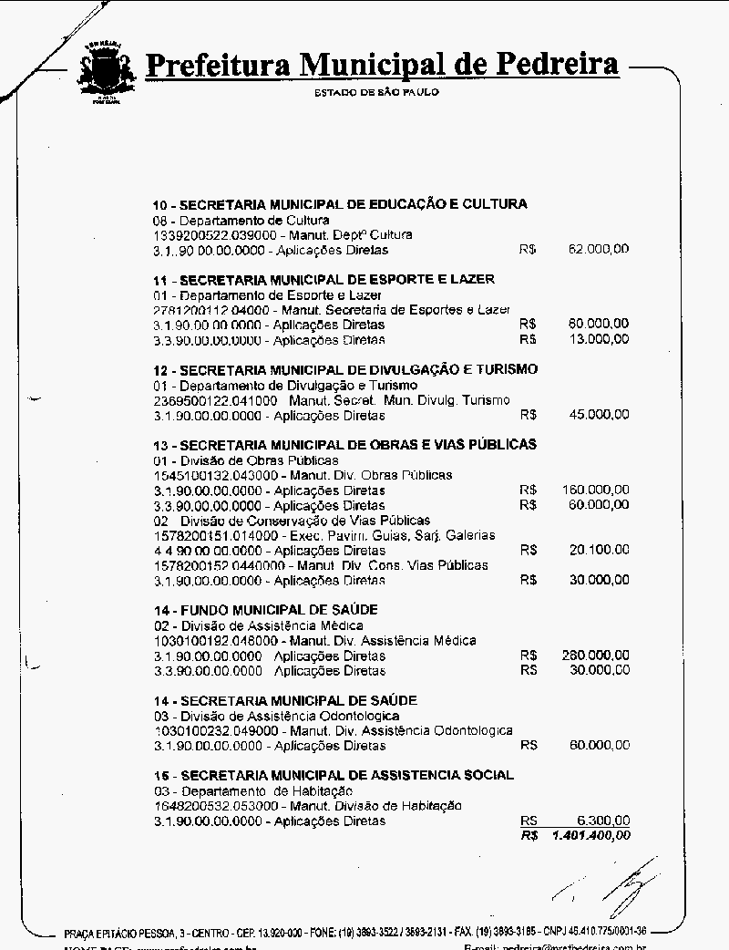 Ementa: Abre crédito suplementar no valor de R$ 1.401.400,00