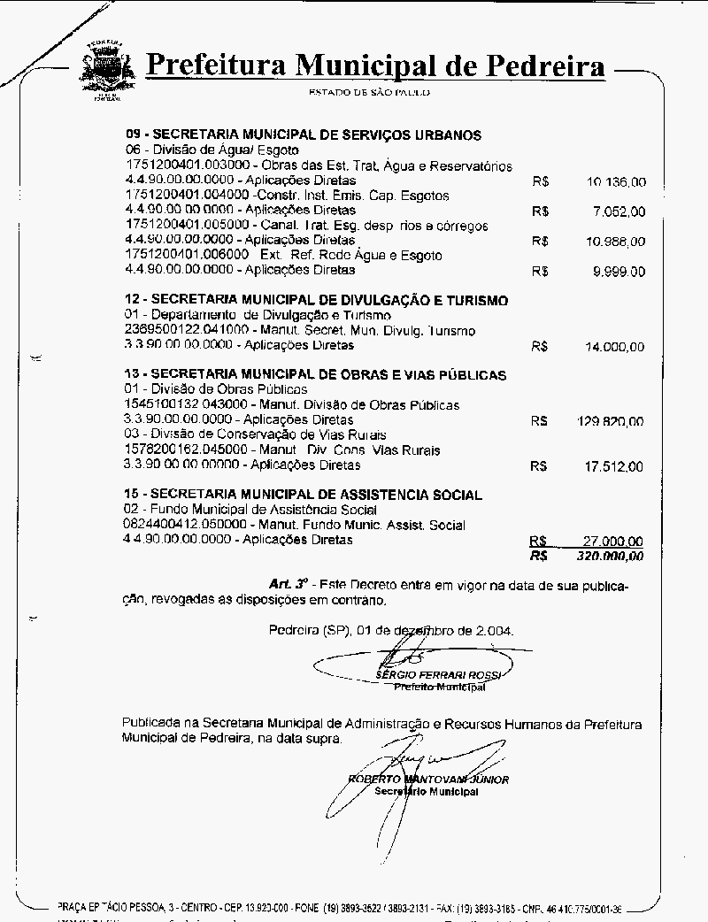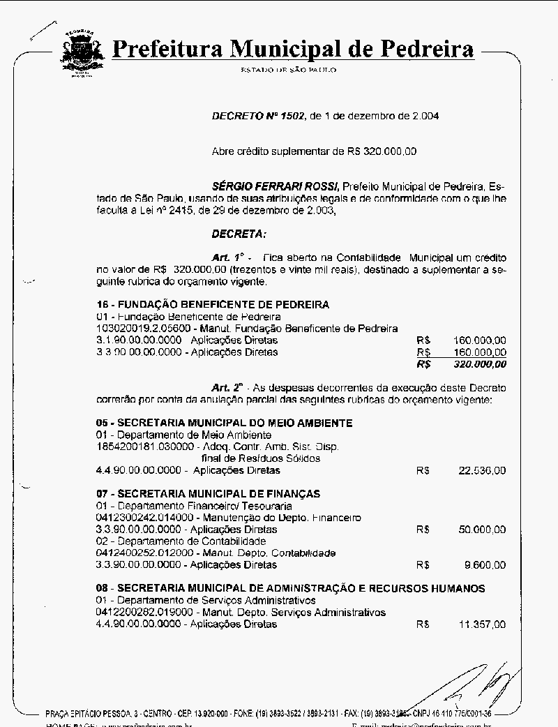 Ementa: Abre crédito suplementar no valor de R$ 320.000,00
