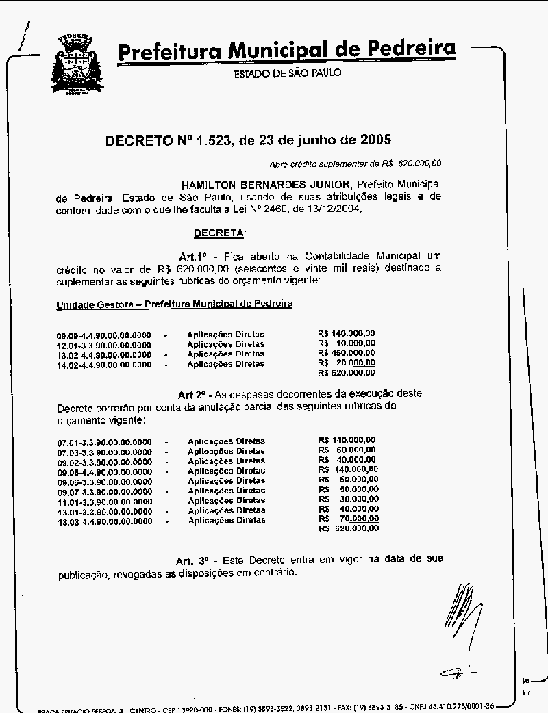 Ementa: Abre crédito suplementar no valor de R$ 620.000,00