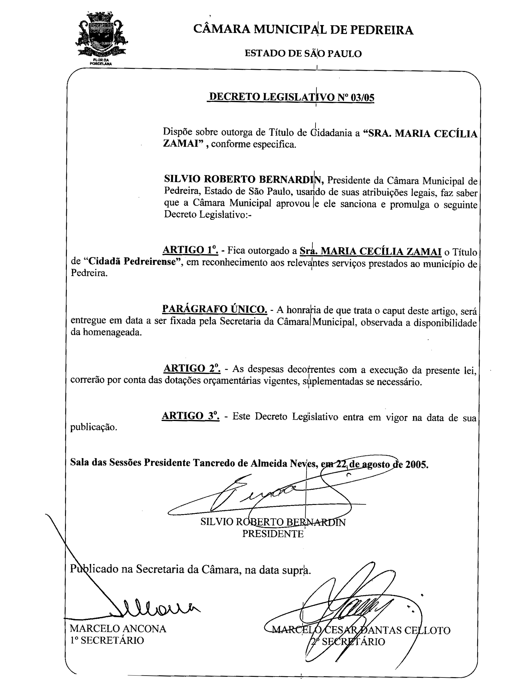 Ementa: Dispõe sobre outorga de Título de Cidadania a "SRA. MARIA CECÍLIA ZAMAI", conforme especifica.