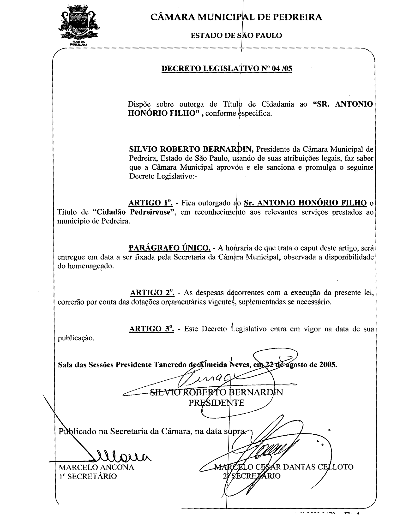 Ementa: Dispõe sobre outorga de Título de Cidadania ao "SR. ANTÔNIO HONÓRIO FILHO", conforme especifica.