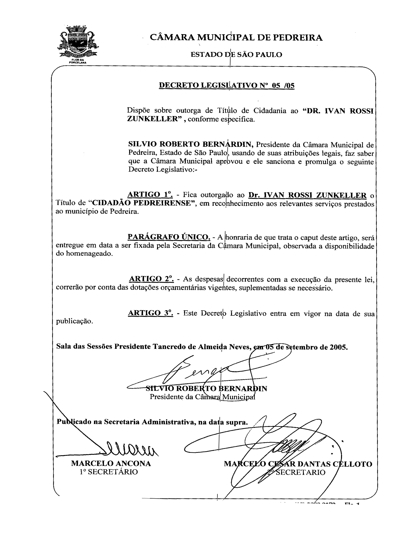 Ementa: Dispõe sobre outorga de Título de Cidadania ao DR. IVAN ROSSI ZUNKELLER , conforme especifica.