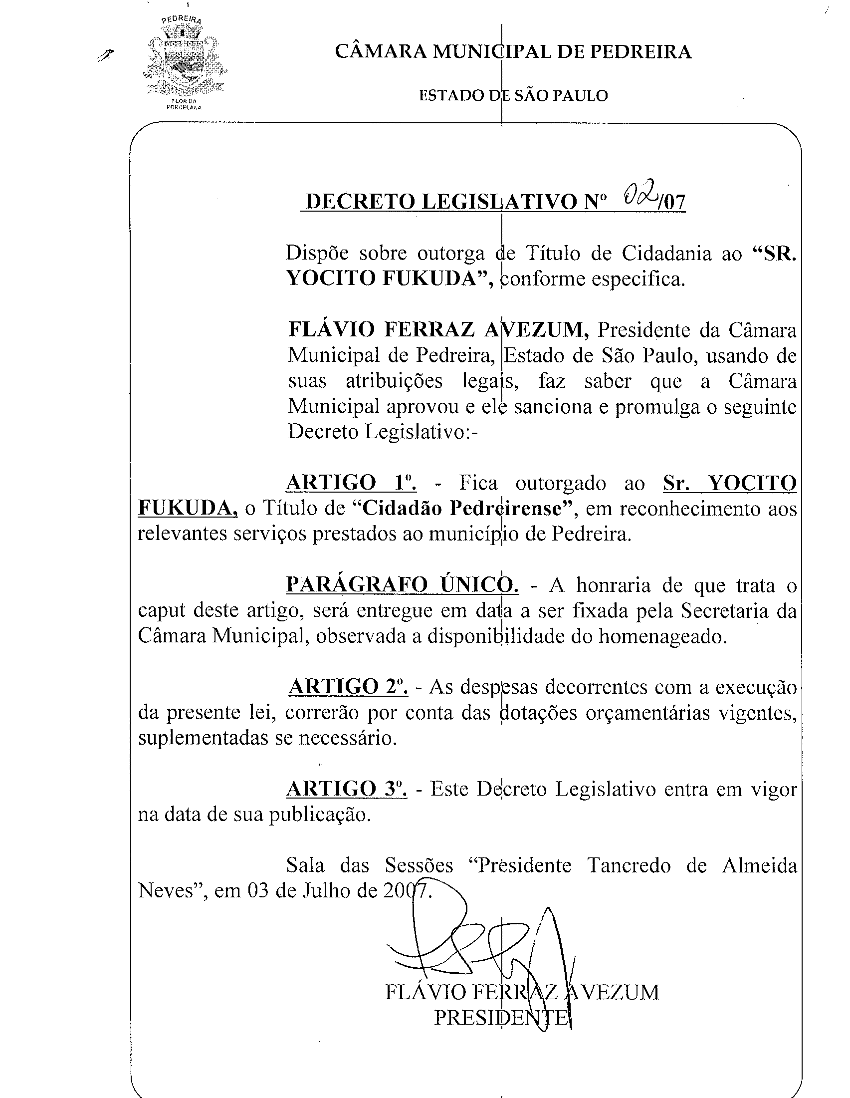 Ementa: Dispõe sobre outorga de Título de Cidadania ao "SR. YOCITO FUKUDA", conforme especifica.