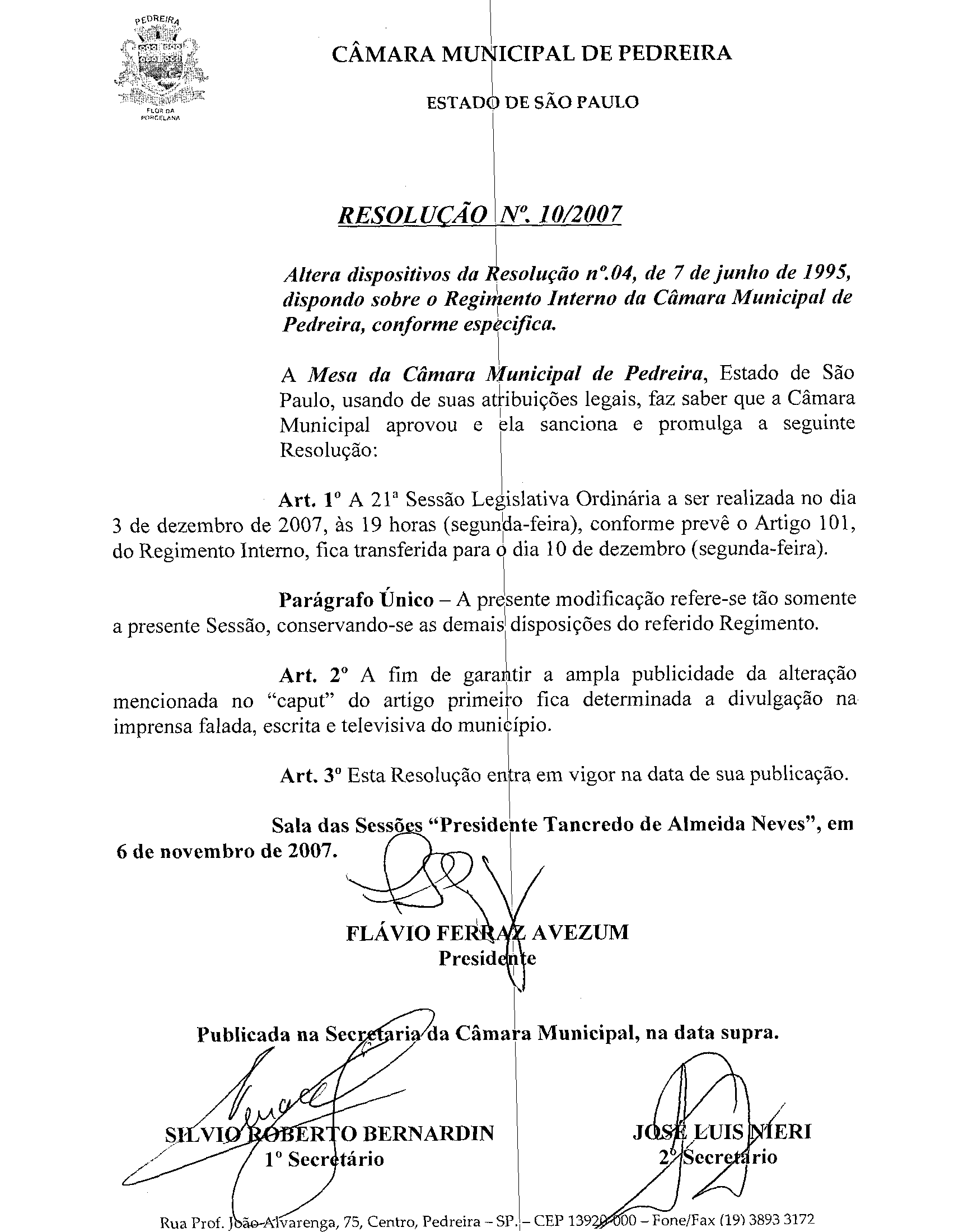 Ementa: Altera dispositivos da Resolução nº 04, de 7 de junho de 1995, dispondo sobre o Regimento Interno da Câmara Municipal de Pedreira, conforme especifica.
