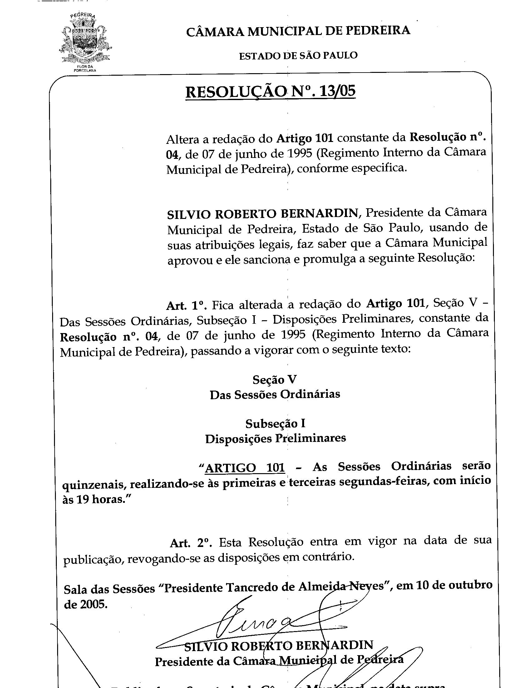 Ementa: Altera a redação do Artigo 101 constante da Resolução n°. 04, de 07 de junho de 1995 (Regimento Interno da Câmara Municipal de Pedreira), conforme especifica.