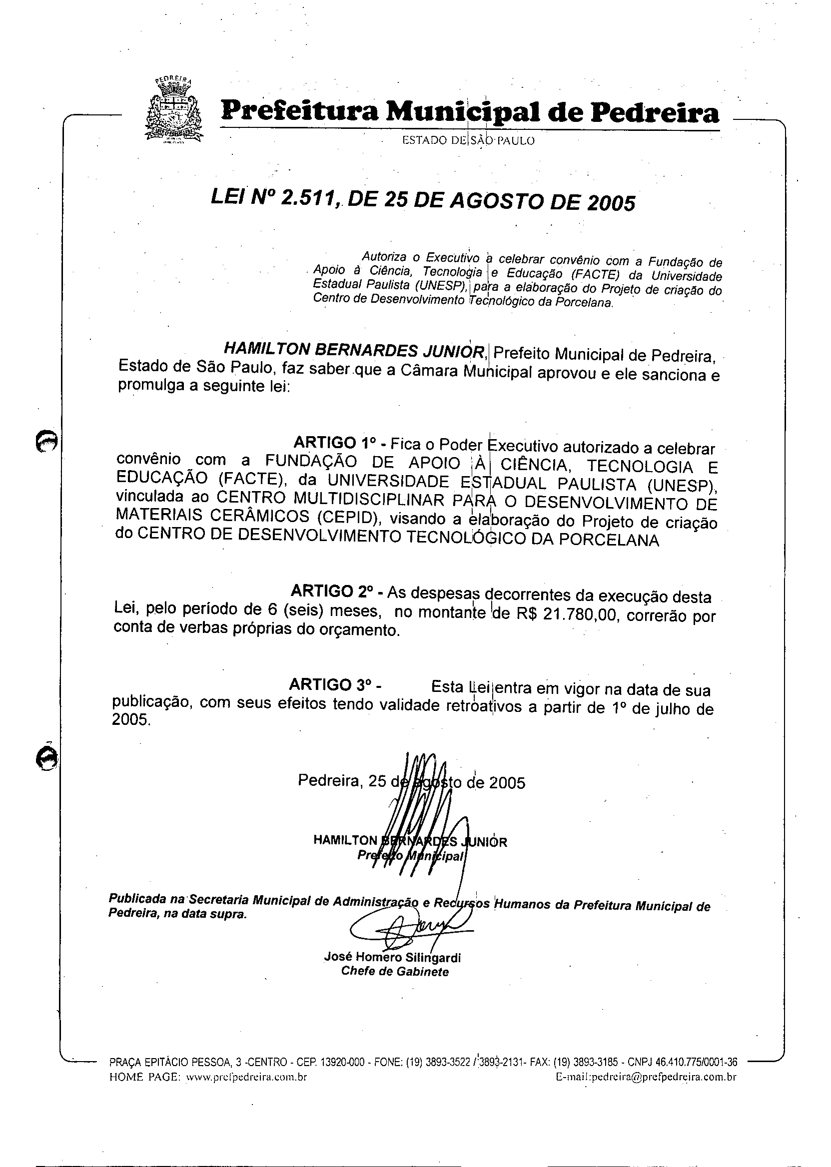 Ementa: Autoriza o Executivo a celebrar convênio com a Fundação de Apoio à Ciência, Tecnologia je Educação (FACTE) da Universidade Estadual Paulista (UNESP), para a elaboração do Projeto de criação do Centro de Desenvolvimento Tecnológico da Porcelana.