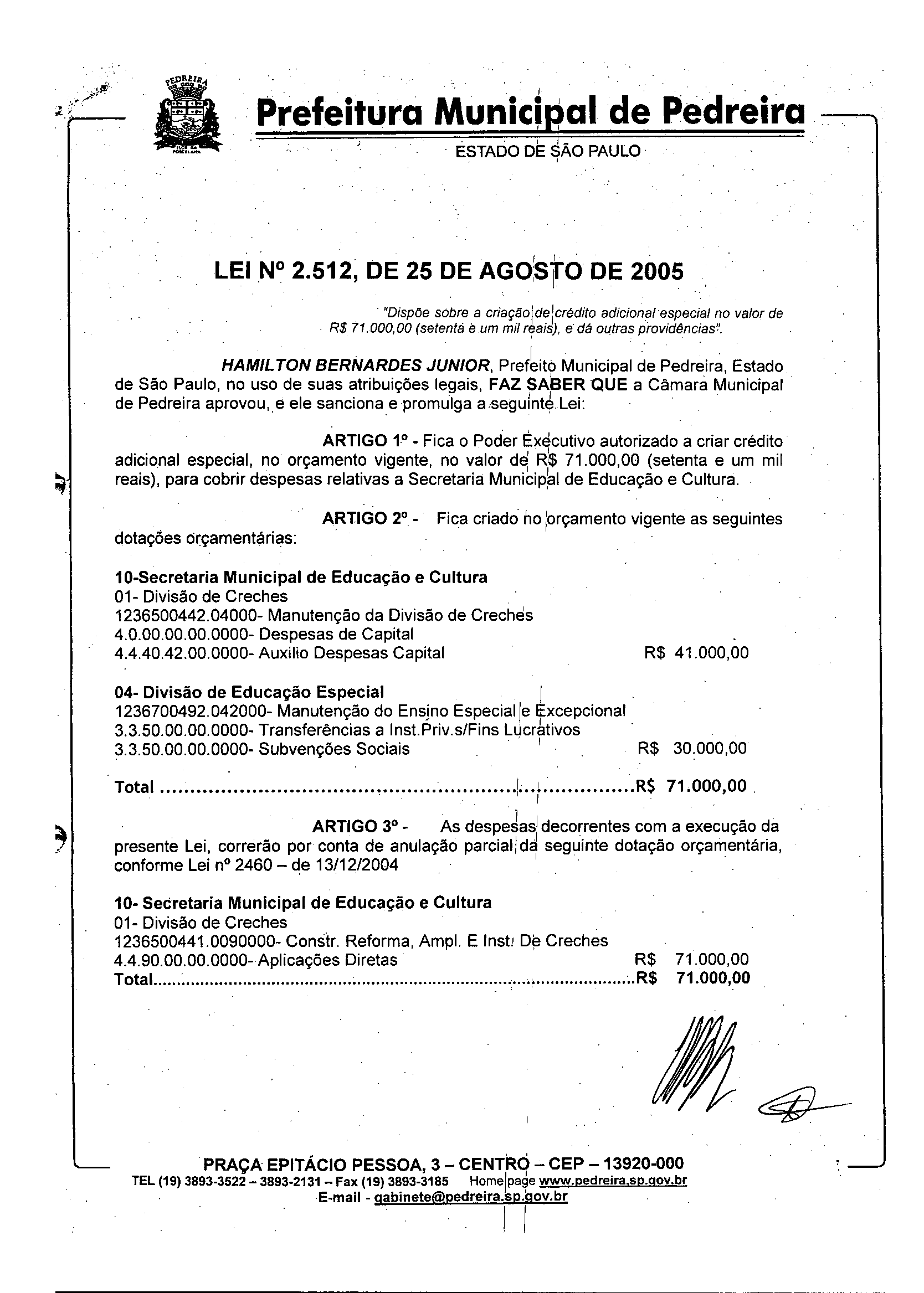 Ementa: "Dispõe sobre a críação de crédito adicional especial no valor de R$ 71.000,00 (setenta è um mil reais), e dá outras providências"